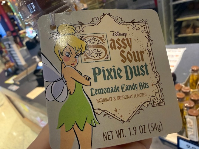 In other candy news, we also came across a new Tinker Bell-themed container of Sassy Sour Pixie Dust, filled with tangy lemonade-flavored candy bits. The Sassy Sour Pixie Dust retails for $9.99 per container.