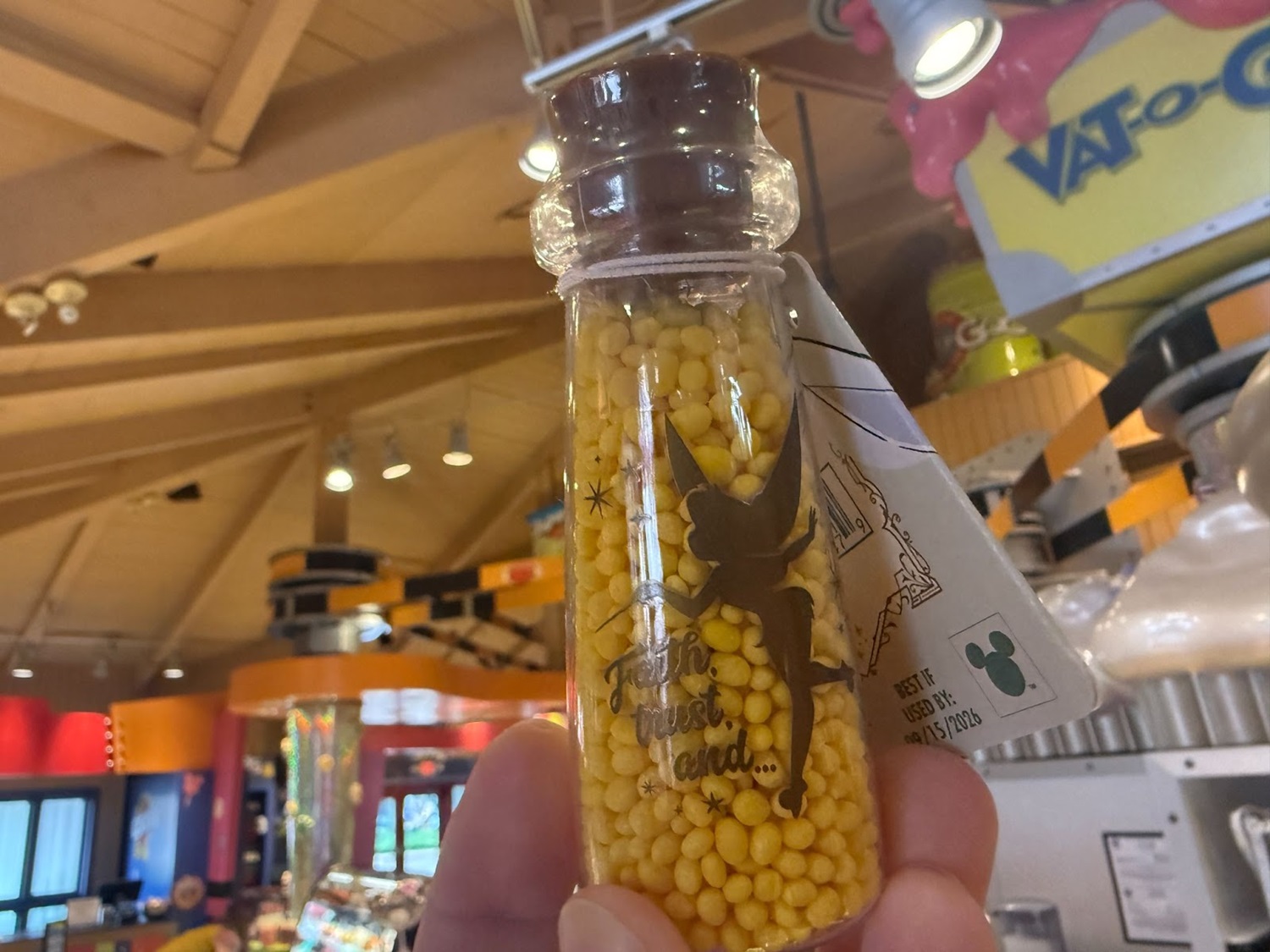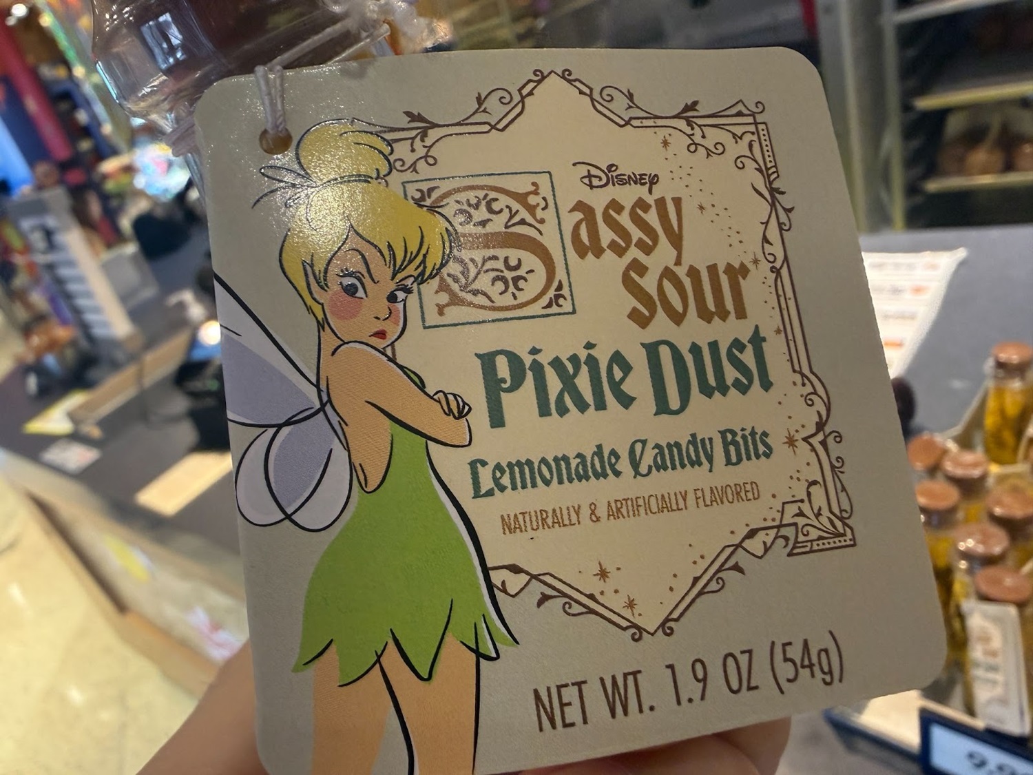 In other candy news, we also came across a new Tinker Bell-themed container of Sassy Sour Pixie Dust, filled with tangy lemonade-flavored candy bits. The Sassy Sour Pixie Dust retails for $9.99 per container.