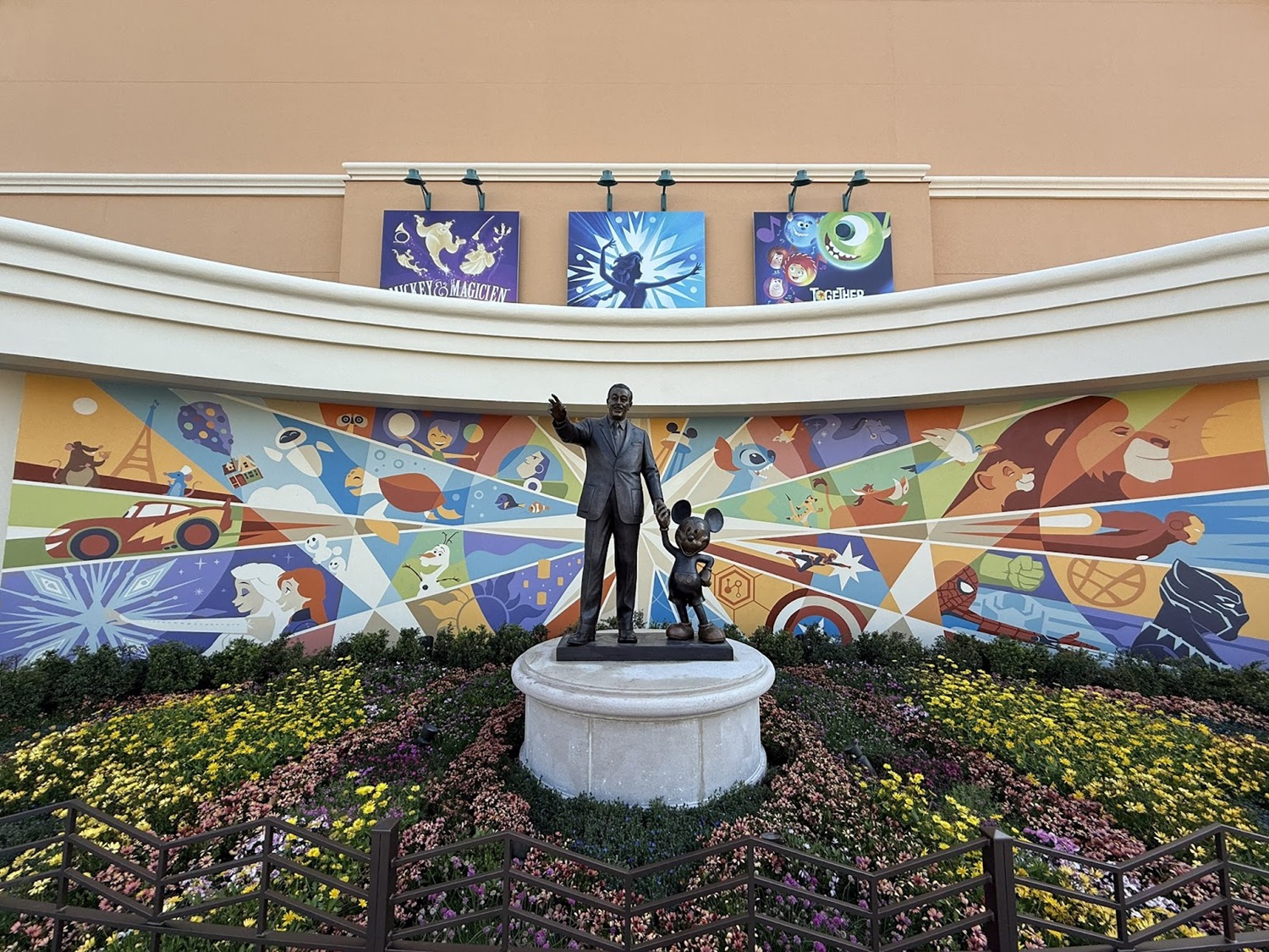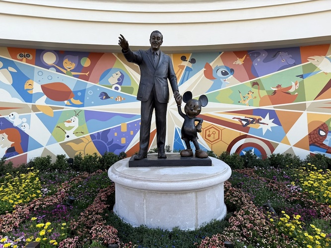 - The newly constructed wall behind the statue leads into World Premiere on either side, with the wall itself featuring a wonderful mural that serves as a tease to the stories that await guests within Disney Adventure World, the new name for the park.