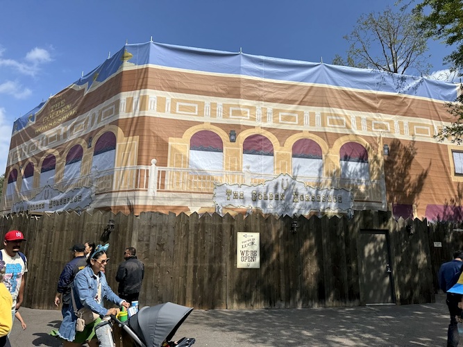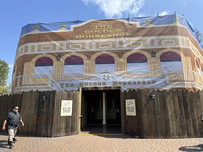 - While at Disneyland, we noticed one of the park’s popular quick service and entertainment locations, The Golden Horseshoe, had been covered in scrims.