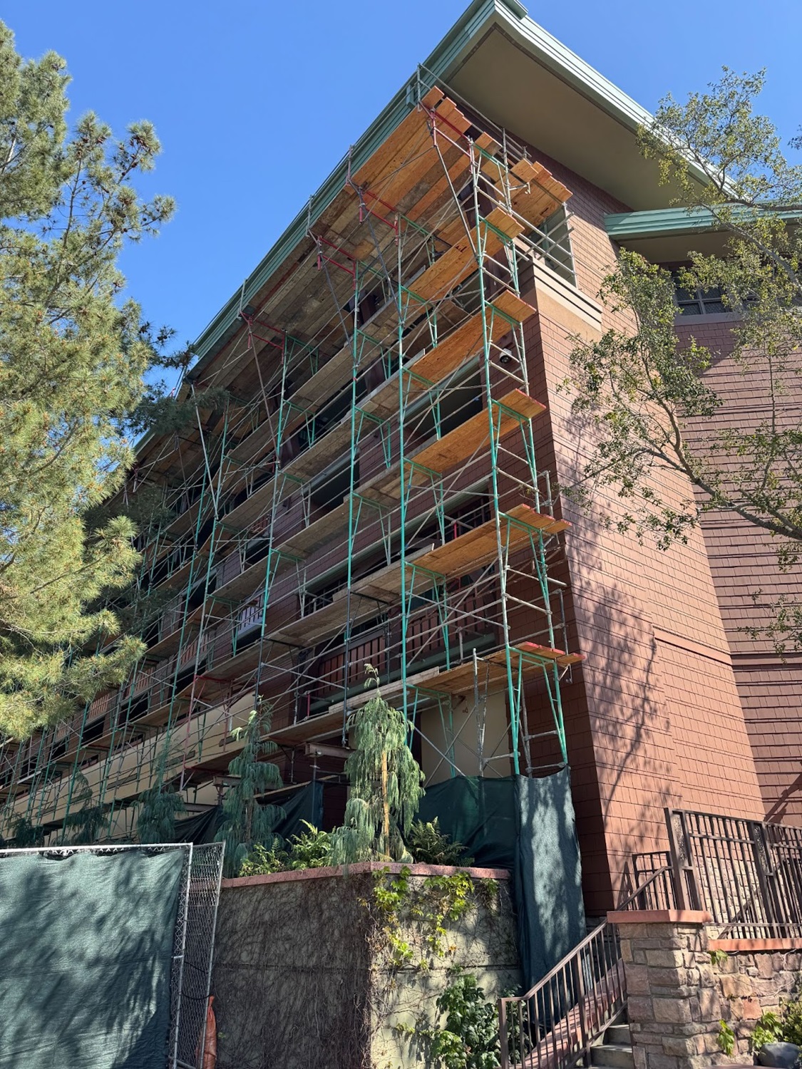 - Scrim decorates the hotel’s iconic arts and crafts-style facade.