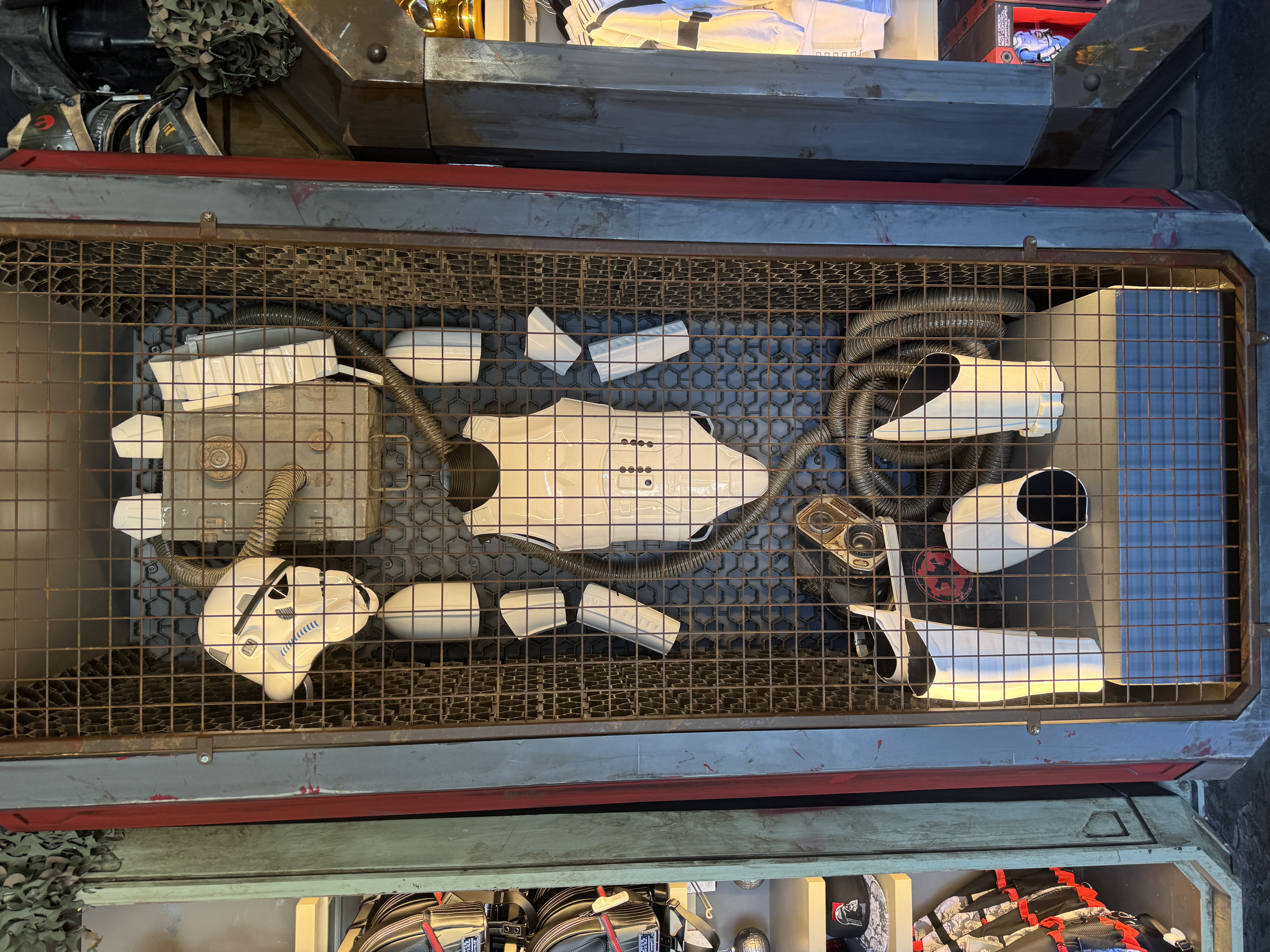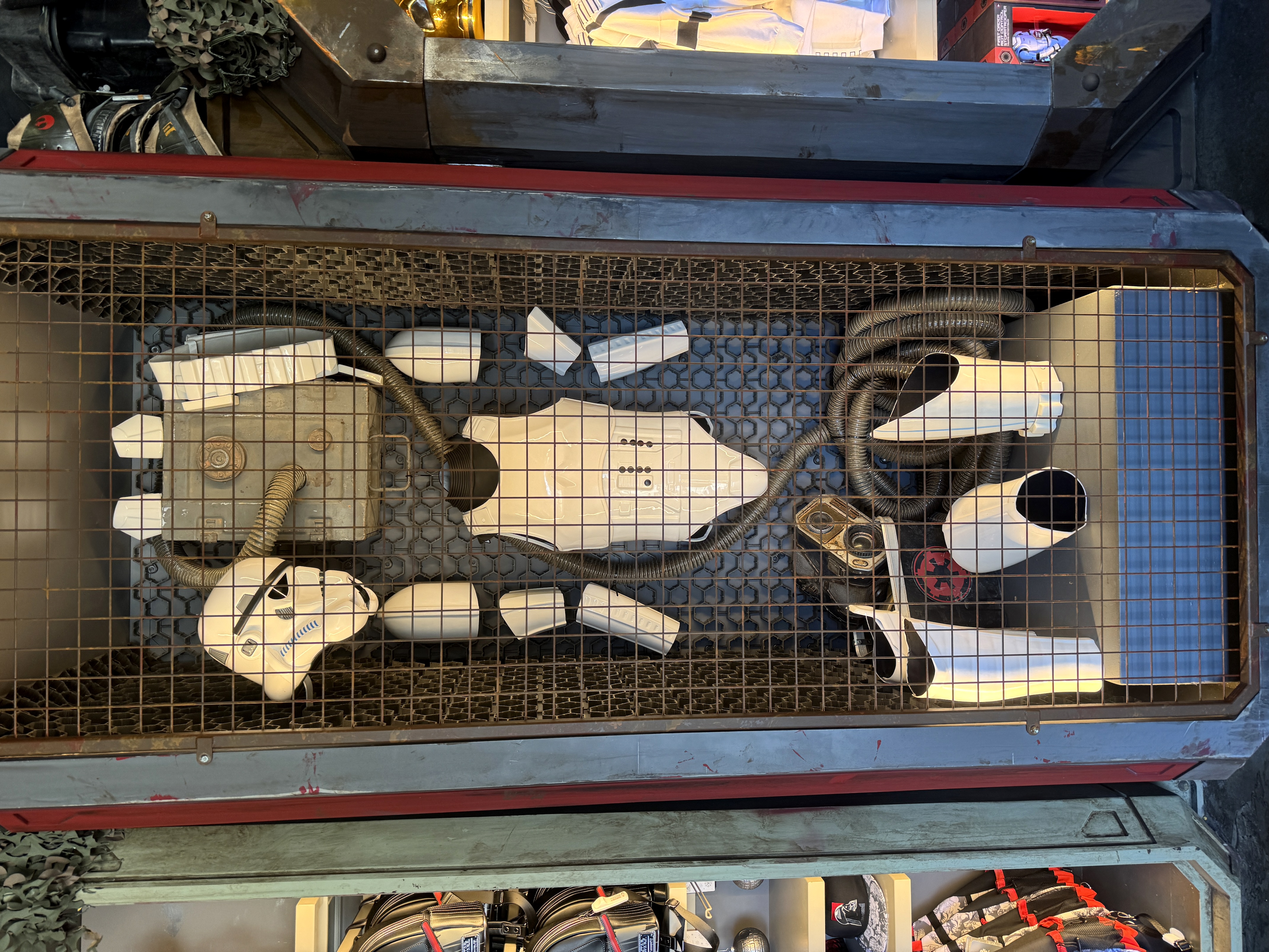 The display case that used to hold the armor of a First Order Stormtrooper now has the disassembled armor of an Imperial Stormtrooper.