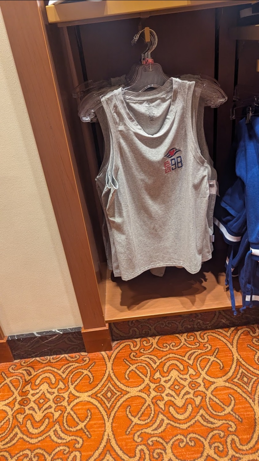 Much of the current merch includes “Est. 98" among the imagery, marking the year the Disney Cruise Line launched, including a tank top for $34.99.