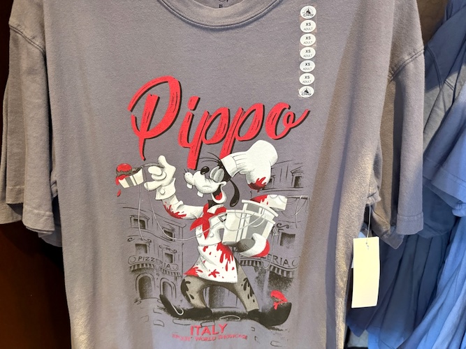 The Italy shirt also goes for one of the core Disney animated characters via Goofy, seen here alongside his Italian name, Pippo.