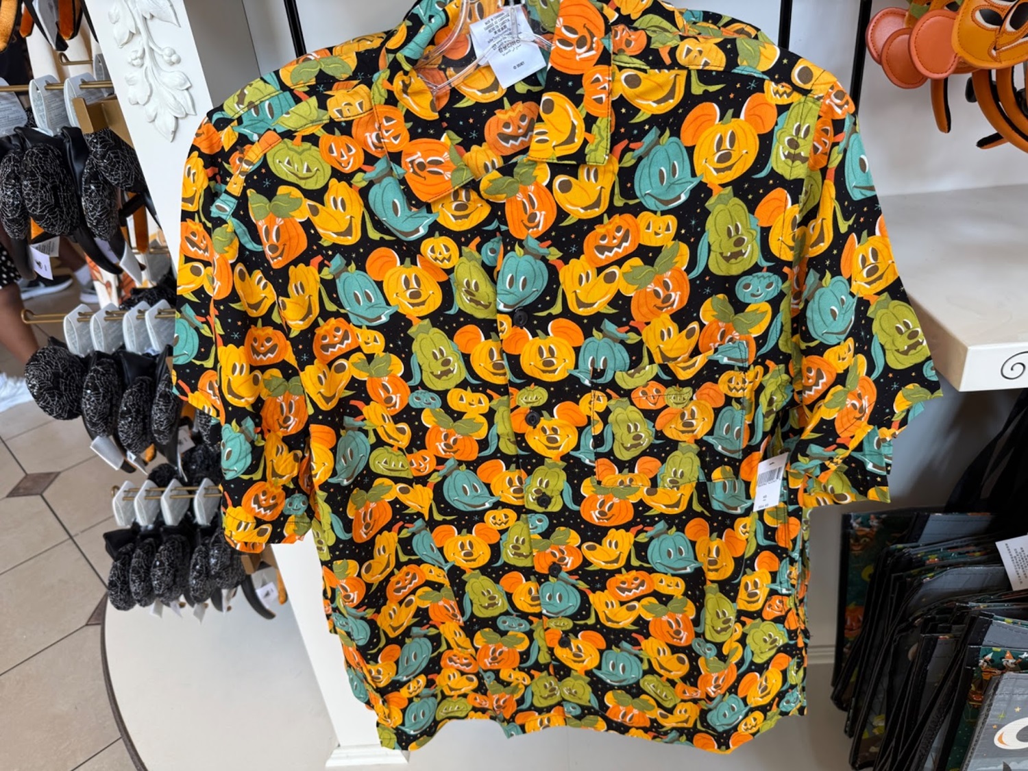 Pumpkin versions of Goofy, Pluto and Donald join Mickey and Minnie on this buttoned Halloween Woven Shirt for $64.99.