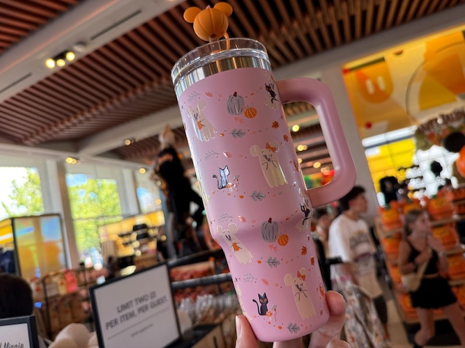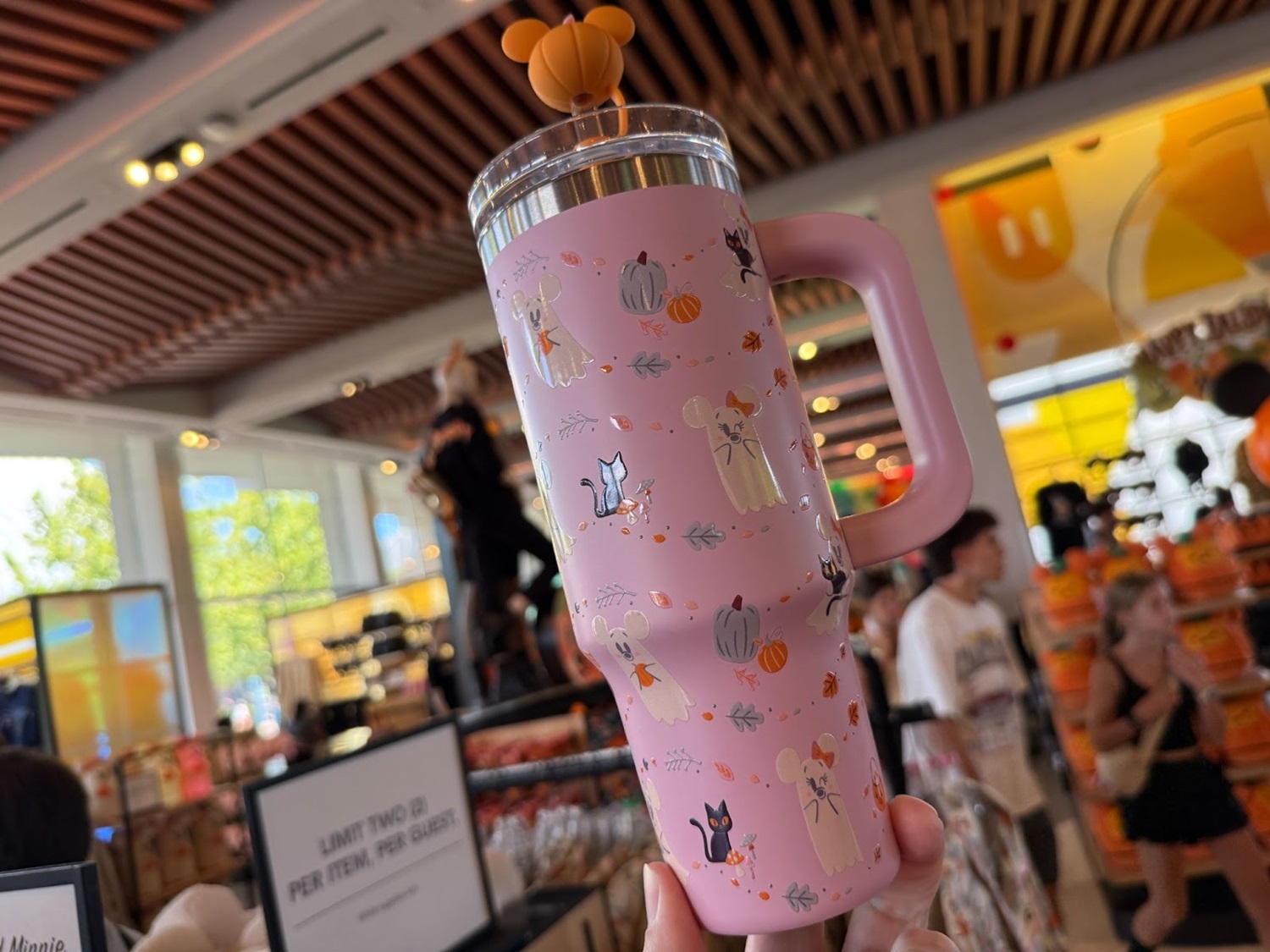 A 30oz pastel pink tumbler decorated with Minnie and Mickey Mouse ghosts, black cats, pumpkins, and autumn leaves, complete with a pumpkin-shaped Mickey straw topper. This festive tumbler is priced at $39.99.