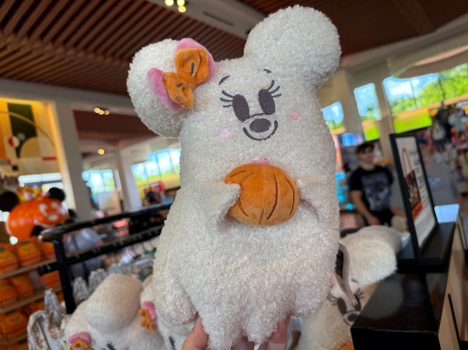 And a white Minnie Mouse ghost plush pillow clutching a small pumpkin— the perfect addition to any cute, spooky home décor. The pillow retails for $34.99.