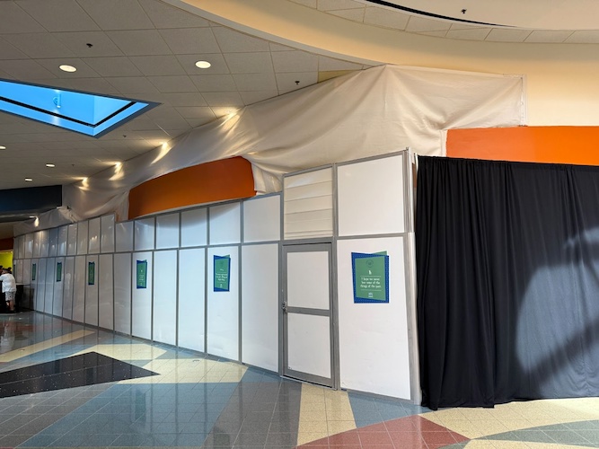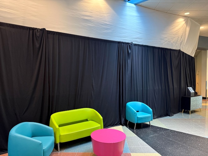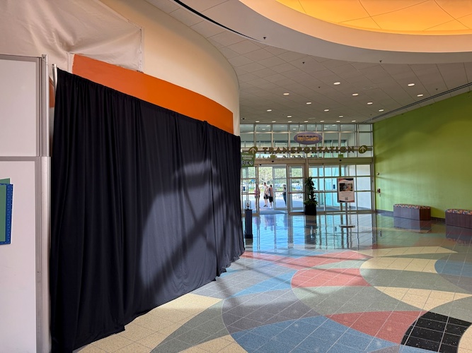 Back in July, the lobby of Disney’s Pop Century Resort began a refurbishment that will bring in a new retro-inspired design. While the lobby remains open, much of it is covered by curtains and construction walls.