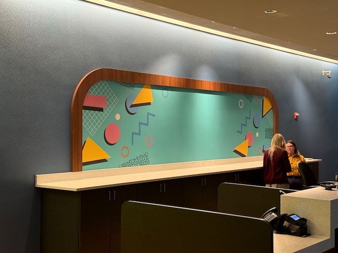 One section of the remodeled check-in area has appeared, with cast members helping guests in front of a simple mural full of 80s-inspired designs that seems like it might get something else added to the center of it – perhaps the Pop Century logo?