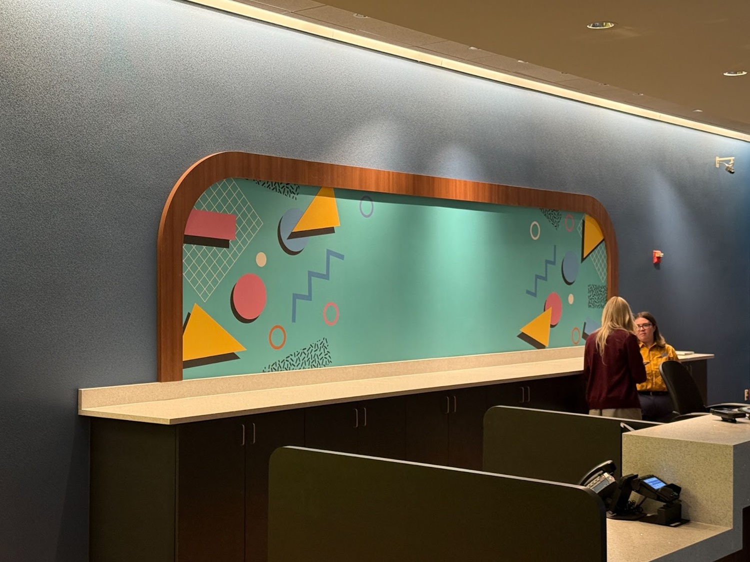 One section of the remodeled check-in area has appeared, with cast members helping guests in front of a simple mural full of 80s-inspired designs that seems like it might get something else added to the center of it – perhaps the Pop Century logo?