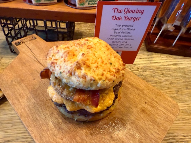 D-Luxe Burger has The Glowing Oak Burger – Two-pressed signature blend beef patties, pimento cheese, fried green tomato, bacon, and jalapeño jam on a cheddar-chive biscuit.