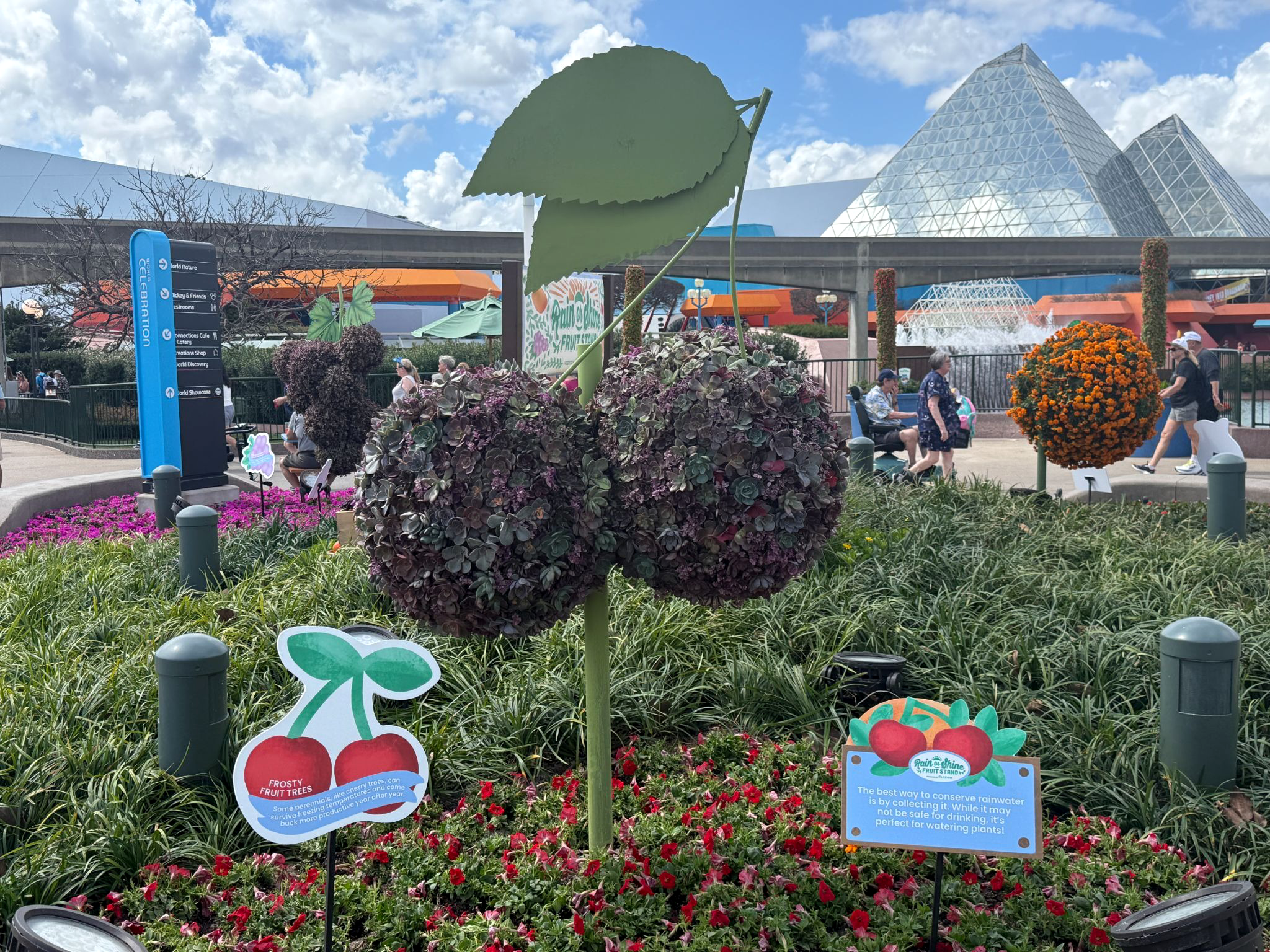 - Located near CommuniCore Hall, the new display features massive fruit-themed topiaries as guests can explore their way through the water cycle.