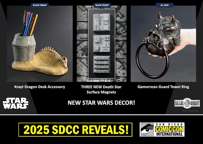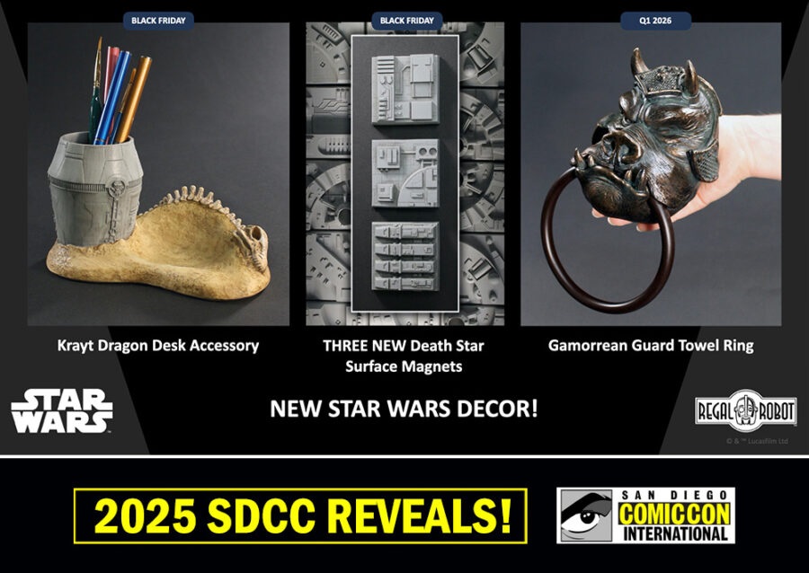 At San Diego Comic-Con, Regal Robot announced an impressive lineup of new creations inspired by the Star Wars and Indiana Jones sagas. Creative Director Robb De Nicola revealed upcoming prop replicas, busts, and unique decor items scheduled for release through early 2026.