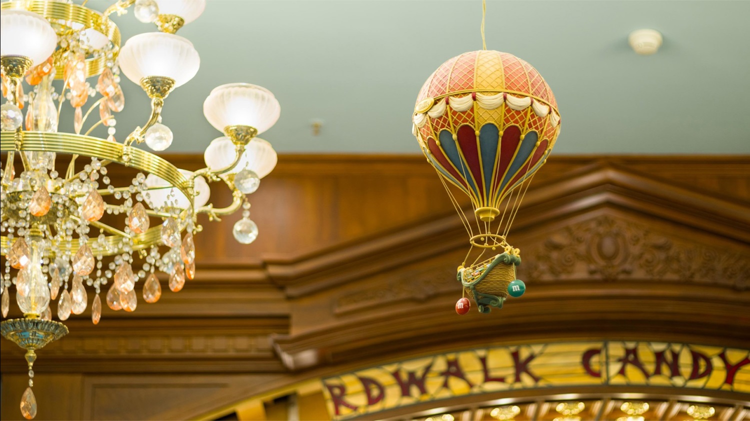 - Looking up, you’ll find whimsical hot air balloons made up of almost 35,000 M&M's lentils.
