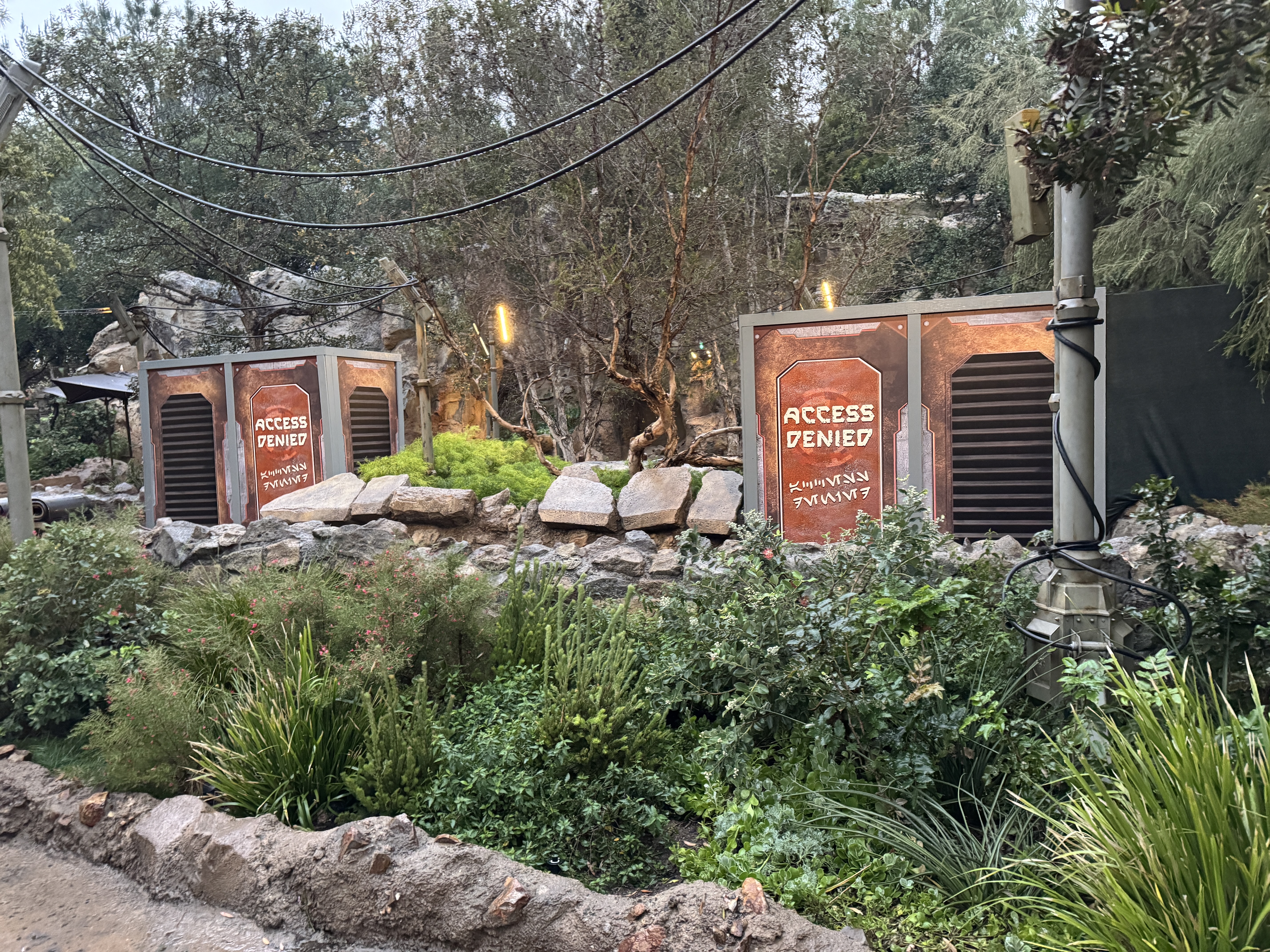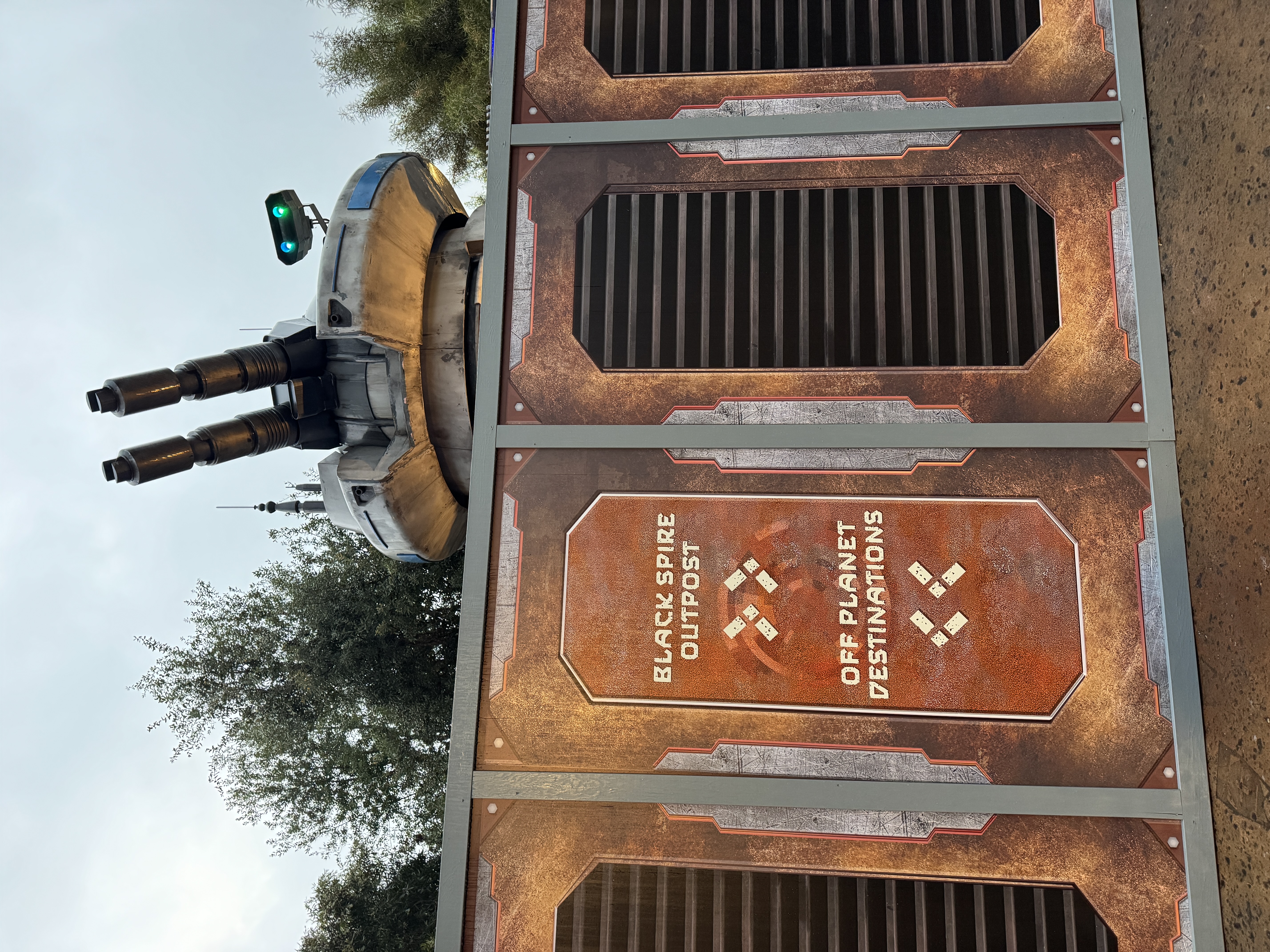 The themed art on the walls denies access to the attraction, while also directing guests to other facilities in Star Wars: Galaxy's Edge.