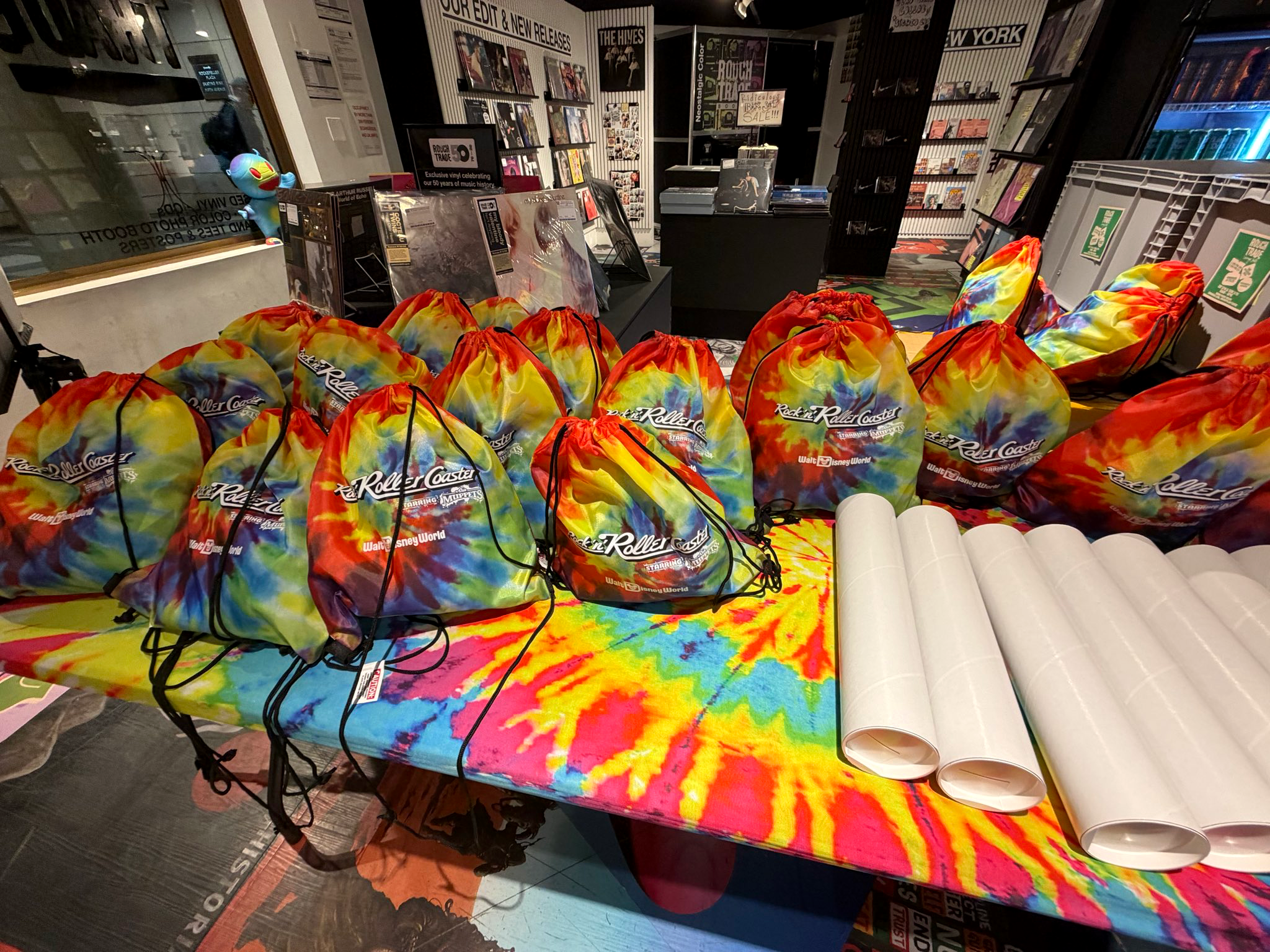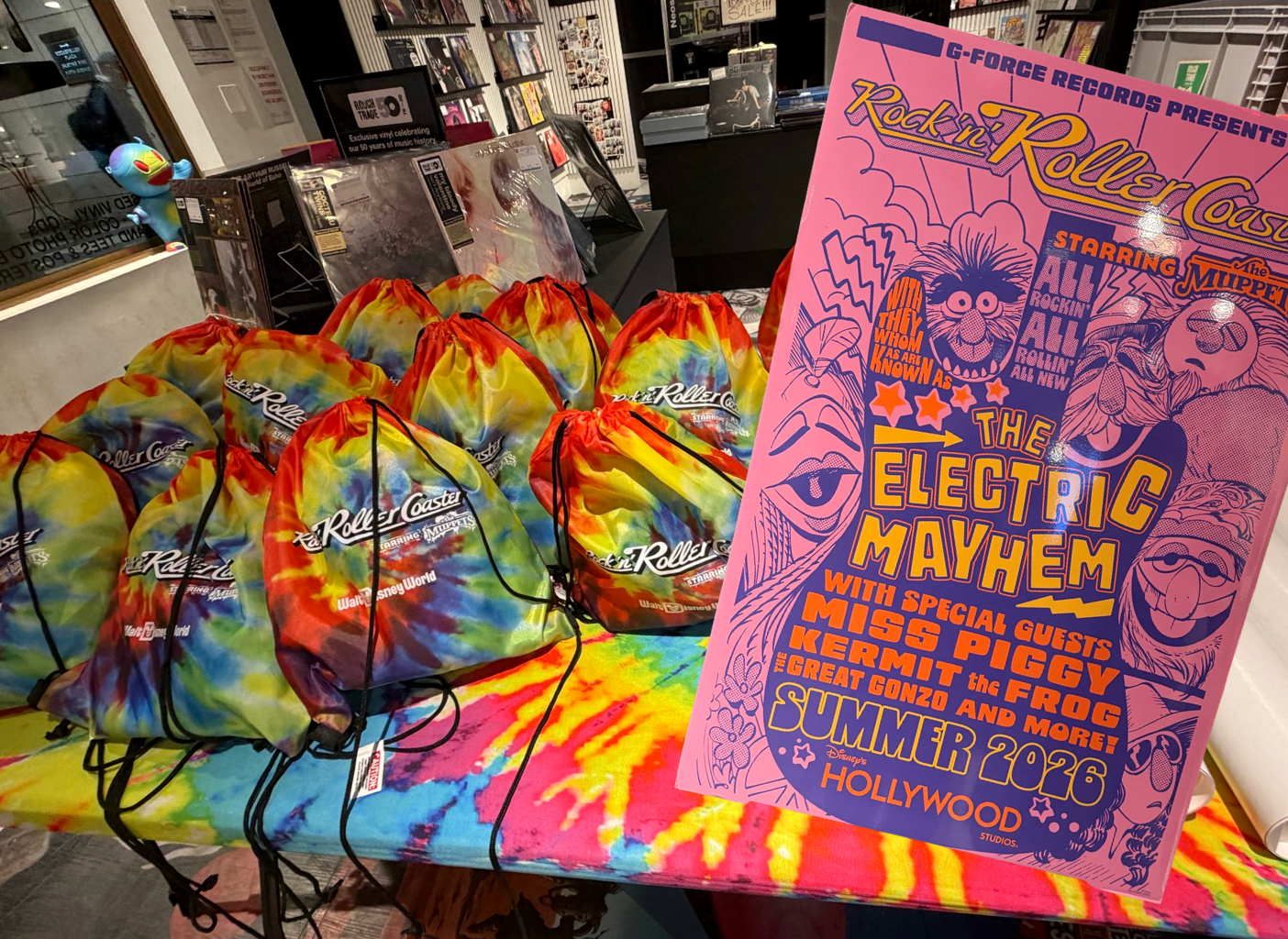 Earlier today, Disney hosted an exclusive listening event at Rough Trade Records in Rockefeller Center, where invited guests, including Laughing Place, got an early preview of the ride’s music. The record store was transformed for the occasion, filled with Muppet-themed details. Guests were welcomed by themed attraction artwork, a special event poster, and six additional posters inspired by each member of the Electric Mayhem that will be in the queue.
