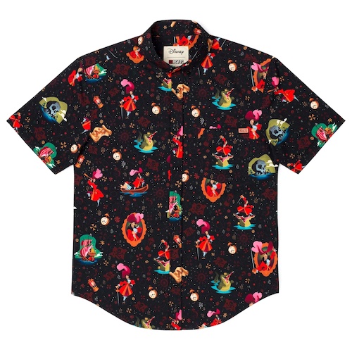 The Hook'd All-Day Polo ($70) features Captain Hook, Mr. Smee, and Tick-Tock the Crocodile, in a print of pirate tattoos and other pirate icons.