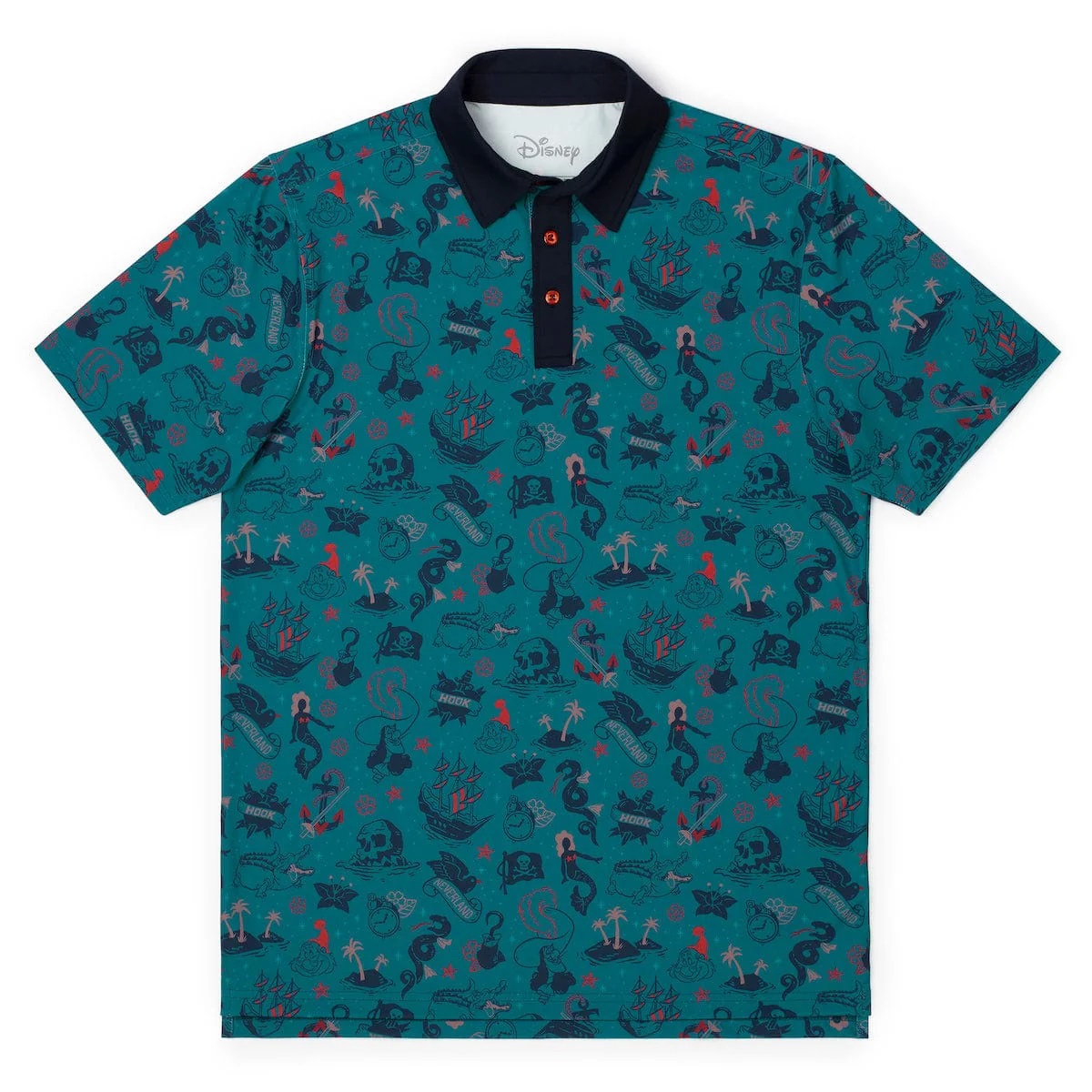 The Hook'd All-Day Polo ($70) features Captain Hook, Mr. Smee, and Tick-Tock the Crocodile, in a print of pirate tattoos and other pirate icons.