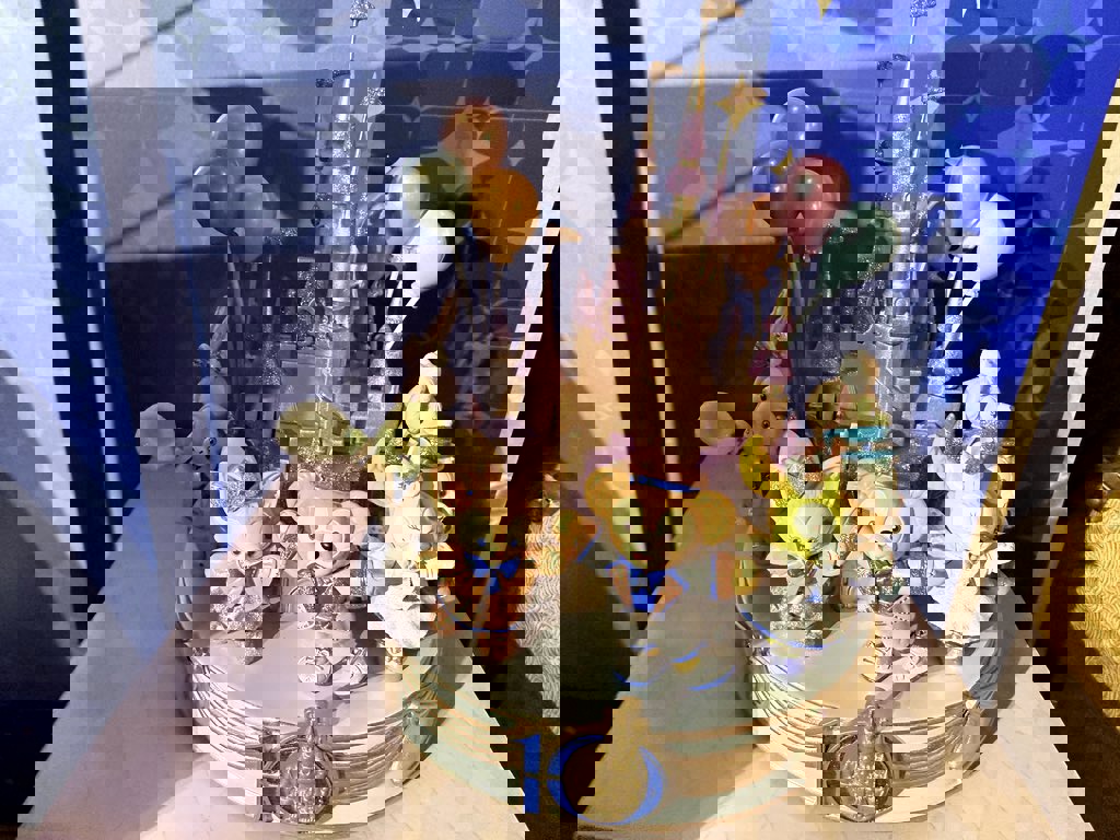 - The float holding the friends is shared like a golden ship and is decorated with playful waves and shimmering birthday details.