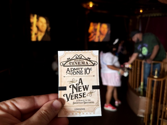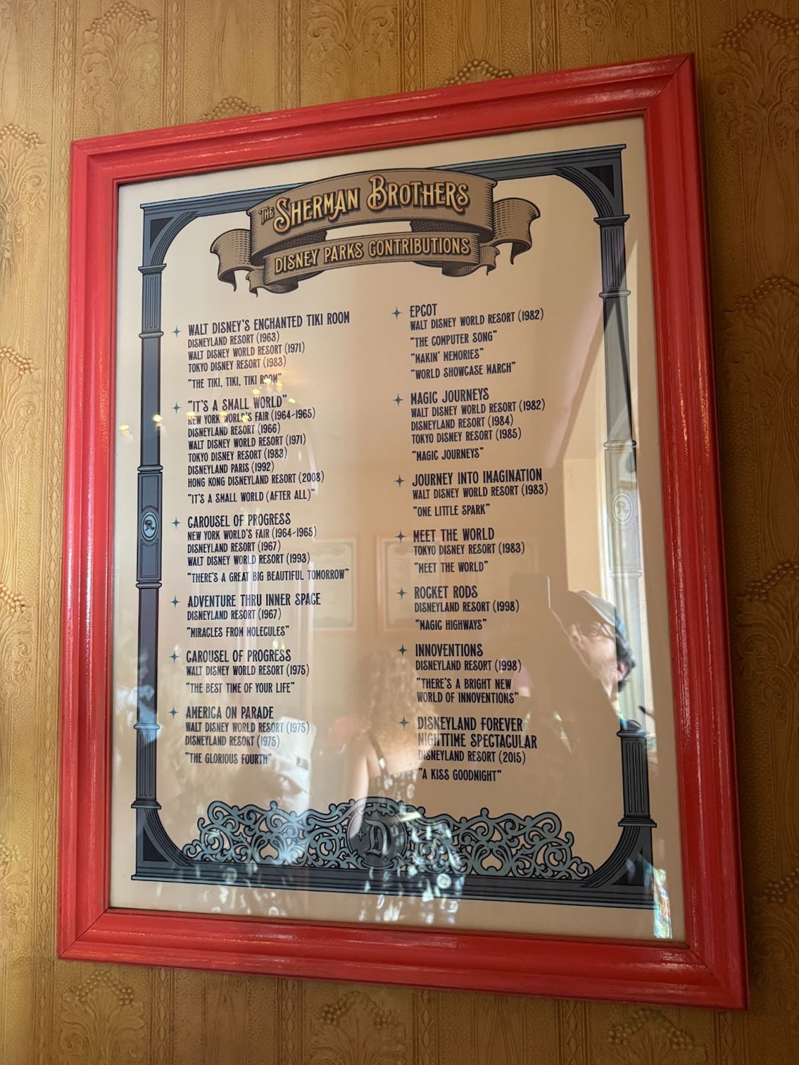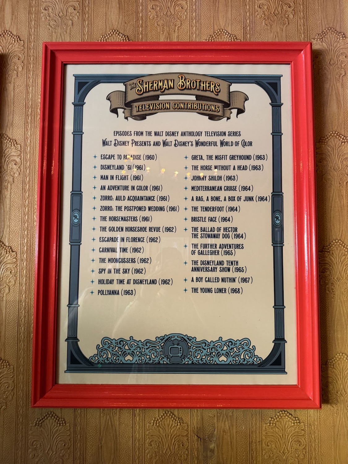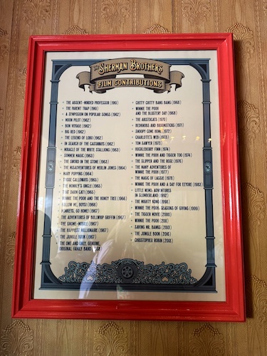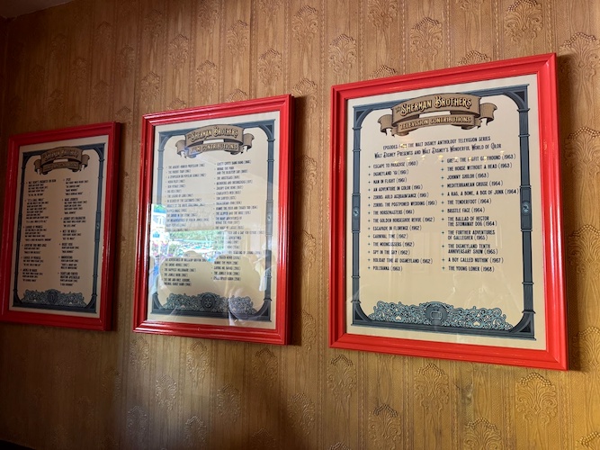 Three posters in the foyer of the Cinema list what appears to be the Sherman Brothers’ entire discography, from film and television, to their iconic songs written for Disney Parks.