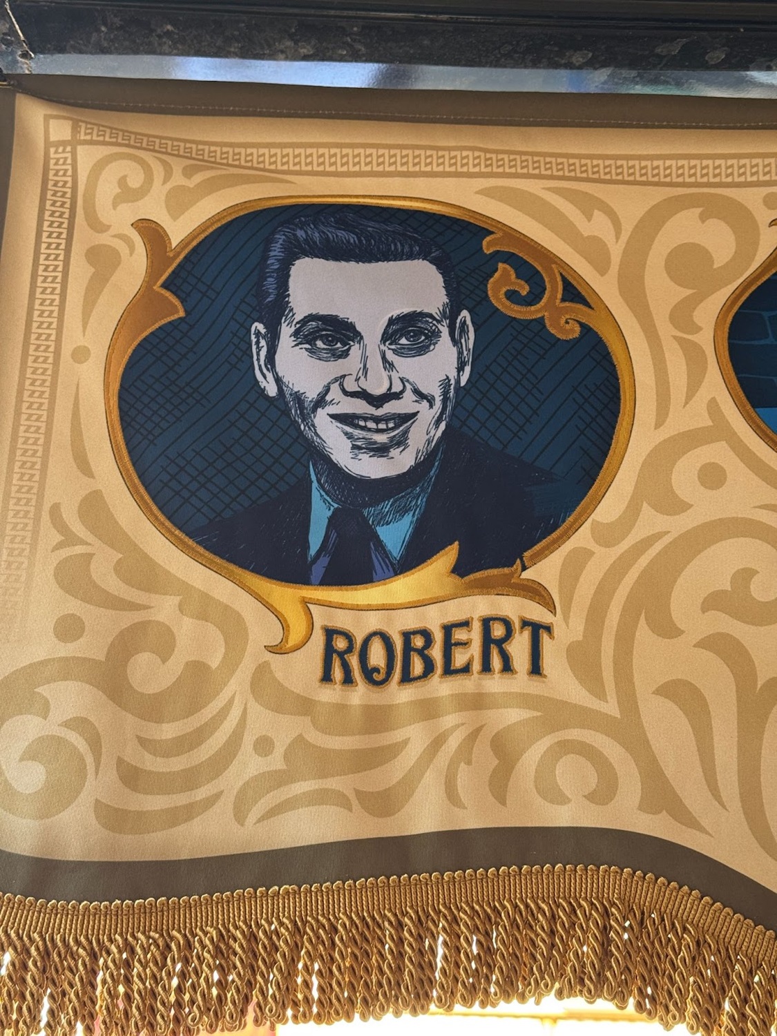 Banners hanging from the theater marquee feature the Sherman Brothers themselves, Richard and Robert, as well as art from a number of the projects they’ve worked on, such as The Many Adventures of Winnie the Pooh, Journey into Imagination at EPCOT, Walt Disney’s Enchanted Tiki Room, and The Aristocats.