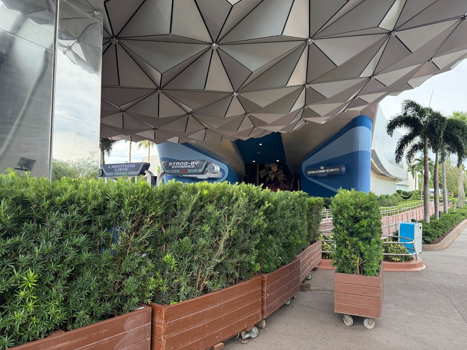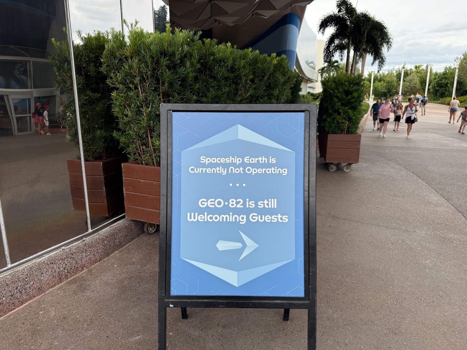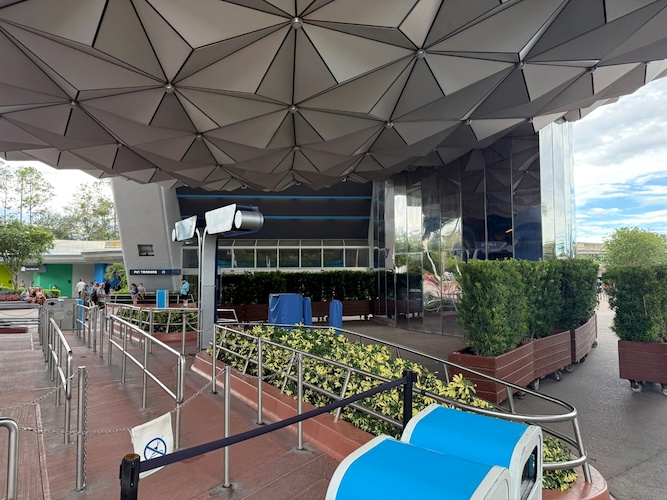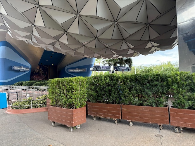 Planters block off access to the entrance area of the attraction, while signage directs visitors to the still-open GEO-82 bar, which opened within the former sponsor lounge a few months ago.