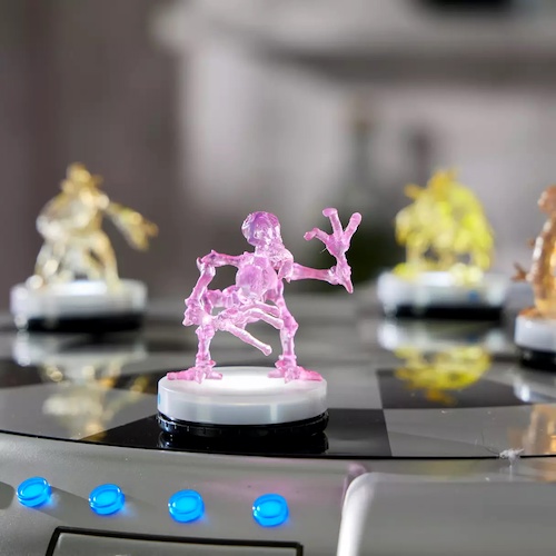 - Each figure is made from a clear plastic that lights up when placed on the board to simulate holo play, illuminated through conductive power.