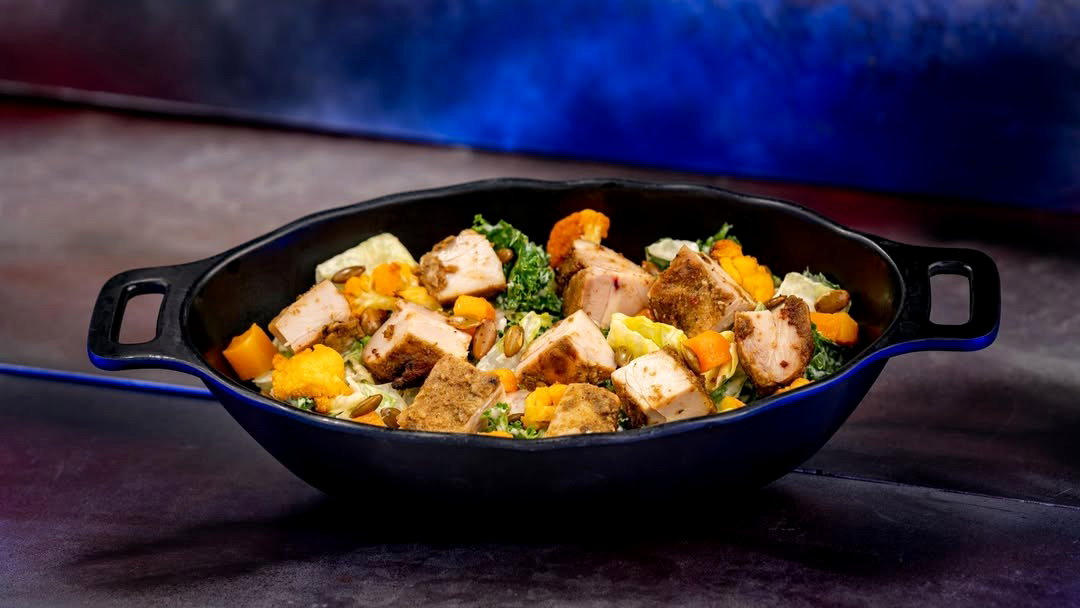 - Endorian Roasted Chicken Salad: Marinated chicken, mixed greens, roasted seasonal vegetables, pumpkin seeds, and green curry ranch