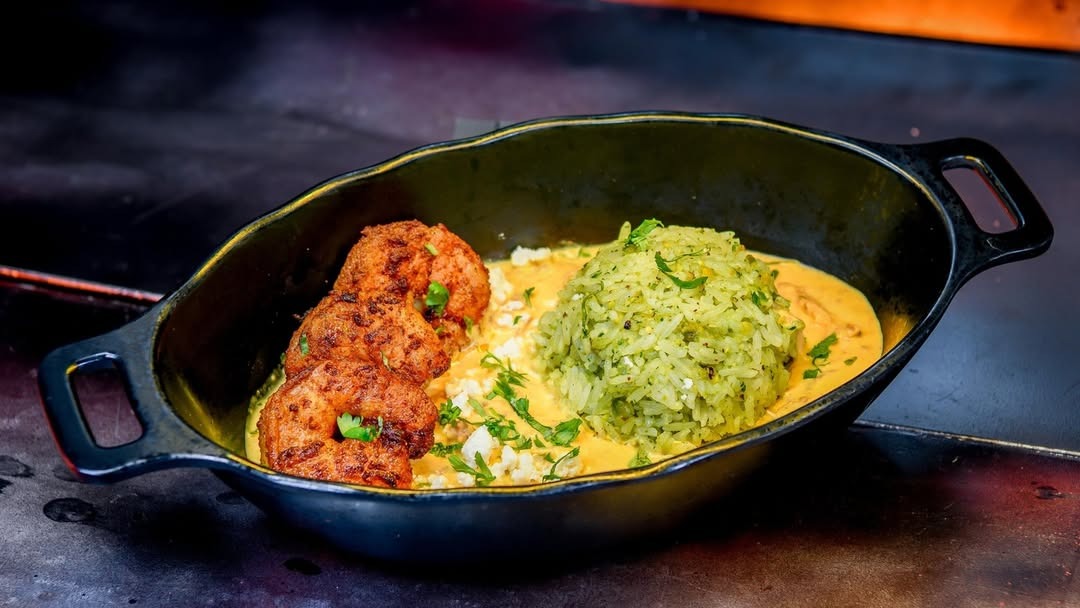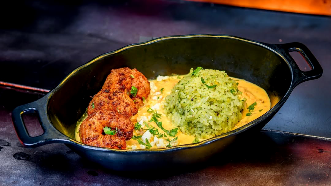 - Kublag Curry: Herb rice, curry-spiced shrimp, creamy chicken curry, cilantro, and feta crumbles