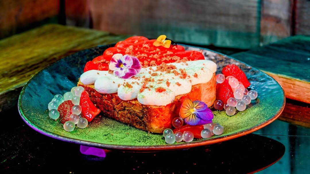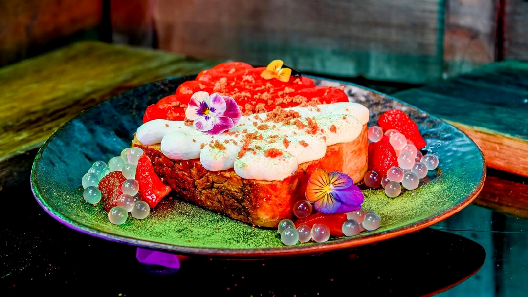 - Millaflower Toast: Cinnamon-swirl toast, whipped ricotta cream, cheesecake frosting, strawberries, lychee pearls, chocolate crumble, and matcha powder