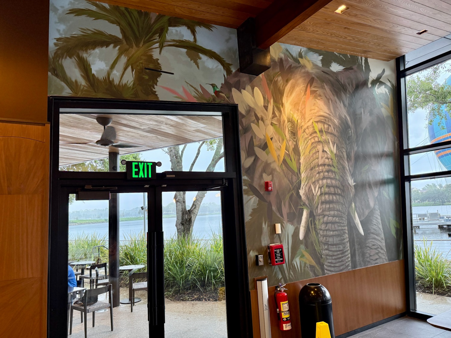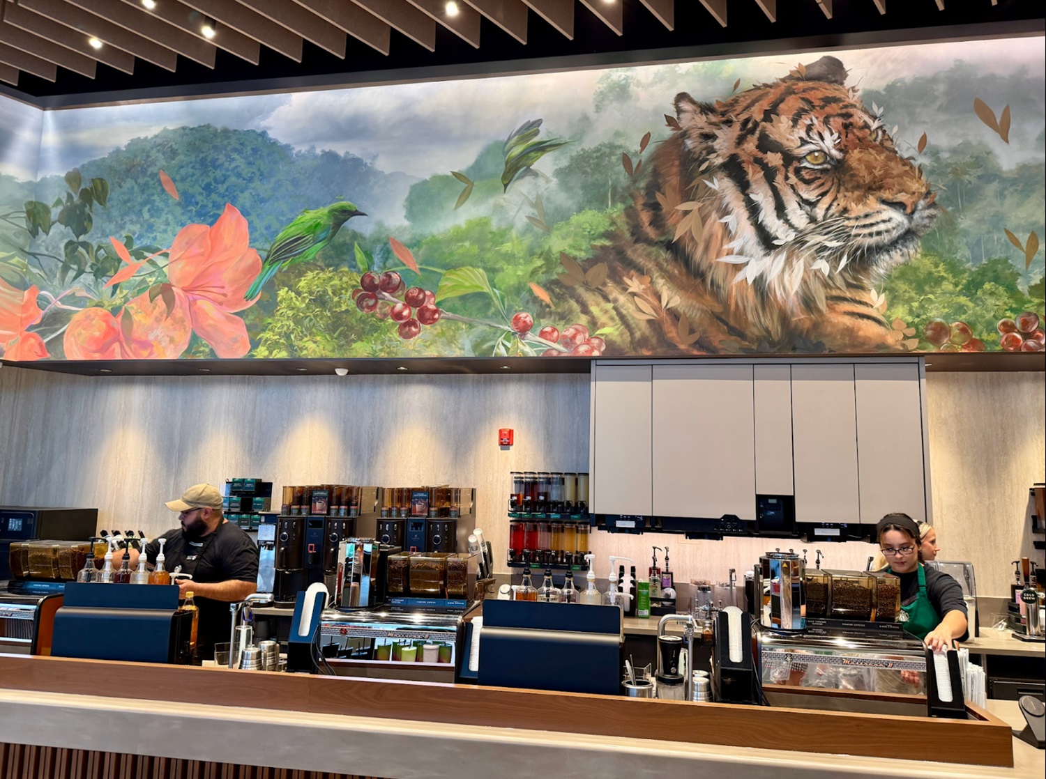 - The space boasts a bright, modern, and open layout, highlighted by a stunning mural of foliage and animals that wraps around the bar and cashier area. New digital menu screens at the counter complete the refreshed look.