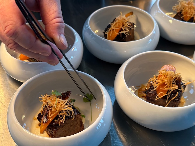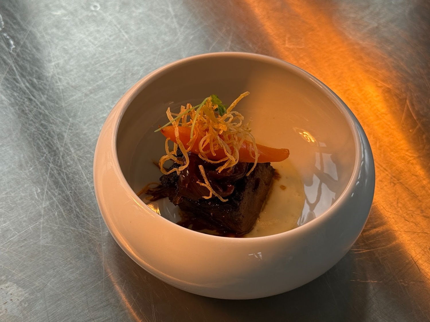 Slow Braised Wagyu Beet Short Rib – Celery Root Espuma, Shallot Marmalade (from Bourbon Steak)