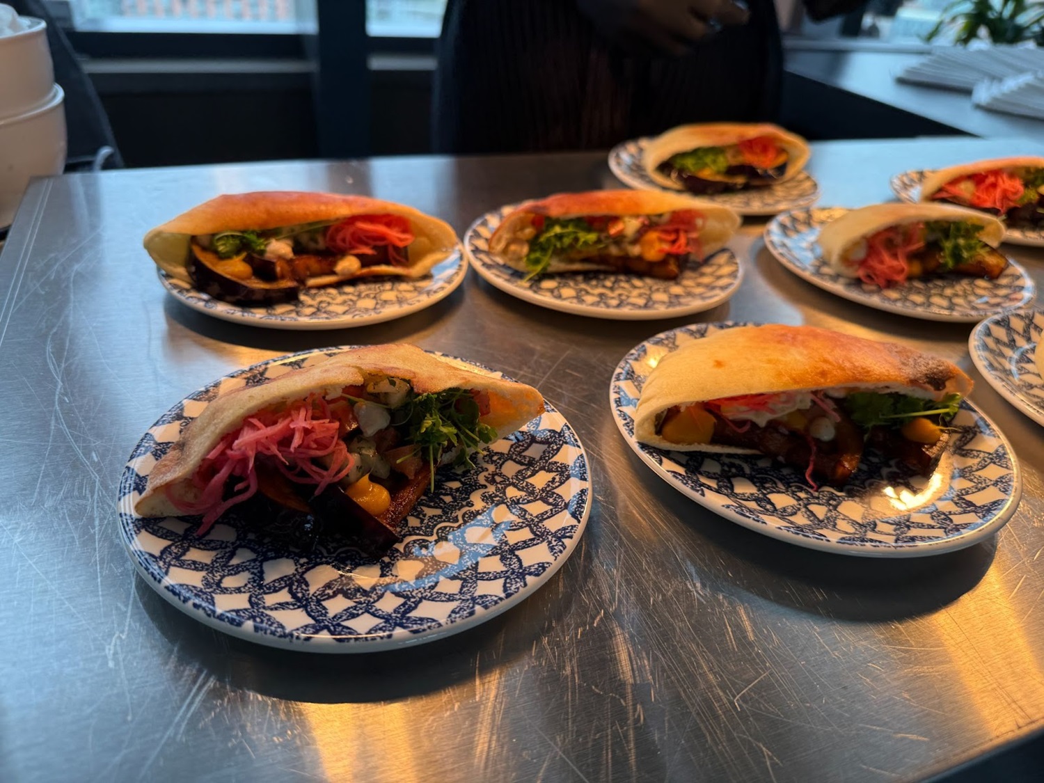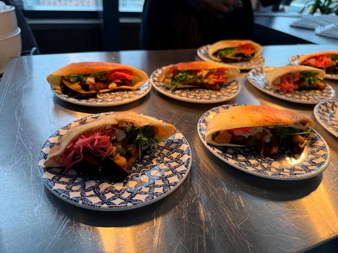 Sabich – Fried Essplant, Israeli Salad, Pickled Watermelon Radish, Tahini Garlic Sauce, Amba, Micro Parsley, Mini Pita (from Amare)