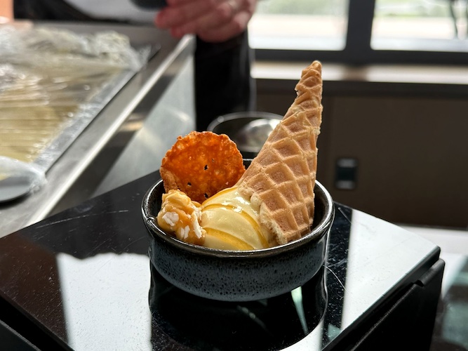 - Sweet Corn Ice Cream Cone – Hot Honey Syrup, Crushed Cheddar Cheese & Caramel Corn (Vegetarian)