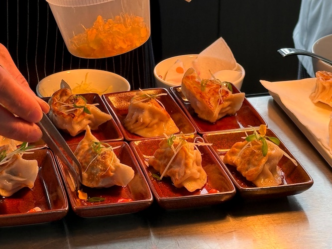 Pan Fried Shrimp & Pork Dumplings – Ginger Black Vinegar Dipping Sauce, House-Made Chili Oil, Yu Chen's Crispy Chili Oil (from Chinatown booth)