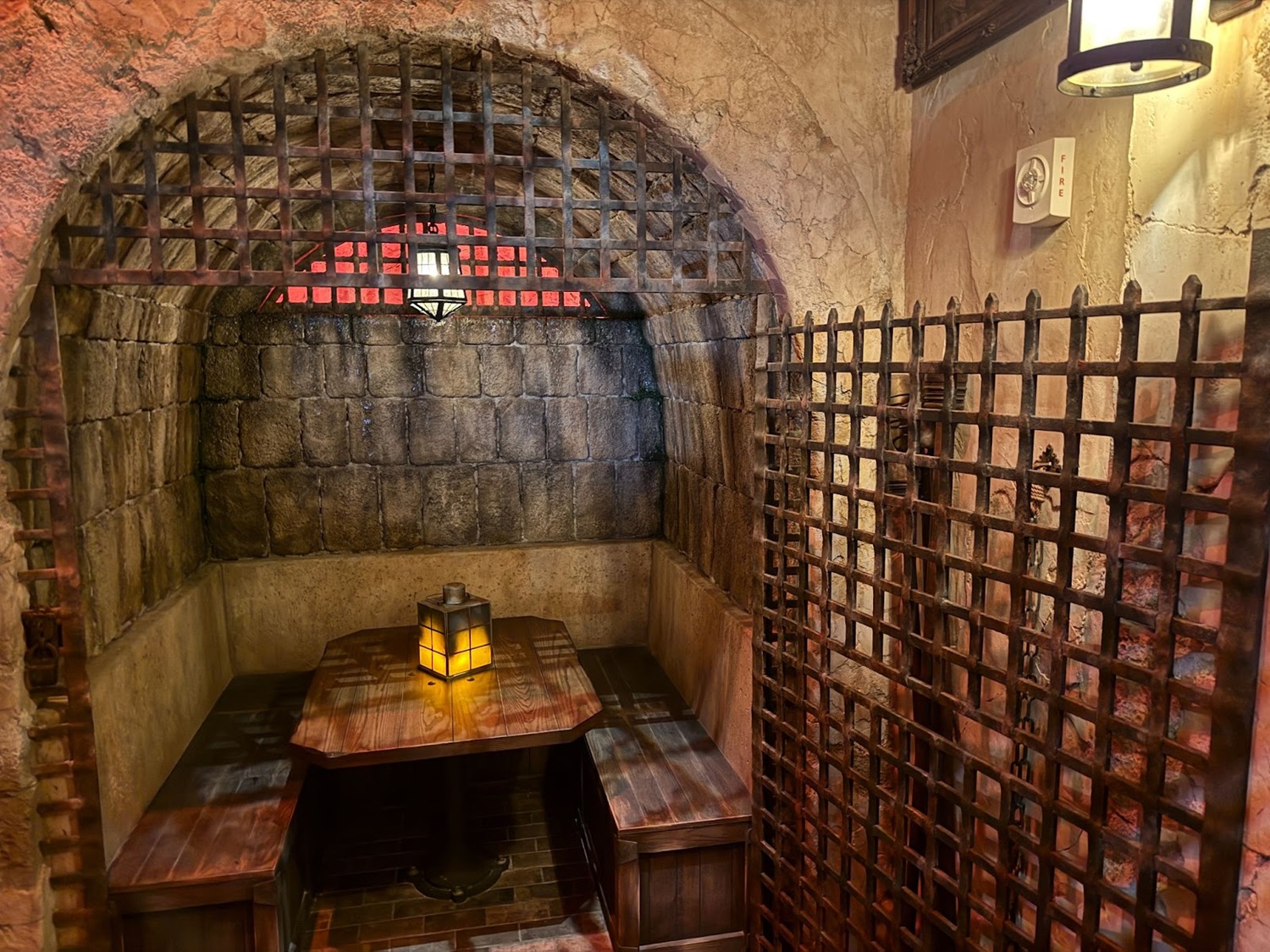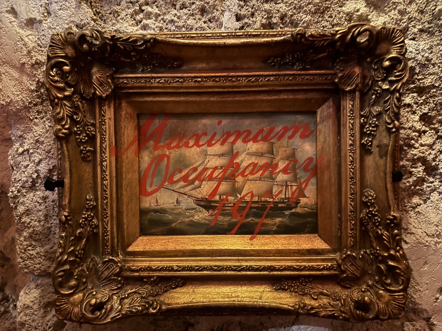 Along the wall, find four grand booths with intricately carved wooden panels. Each booth tells stories of the exploits of notorious pirates, whose legends still echo across the seas.