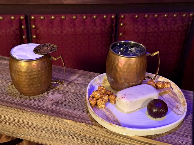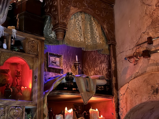 Perhaps the most exciting element of all in this new lounge is Rummy the Parrot, an animatronic parrot inspired by the old Barker Bird at the entrance to the attraction. Rummy welcomes patrons and keeps an eye on the crew, quick with a story, joke, or song as he wobbles out from his main roost in the hollow of the skull’s eye.