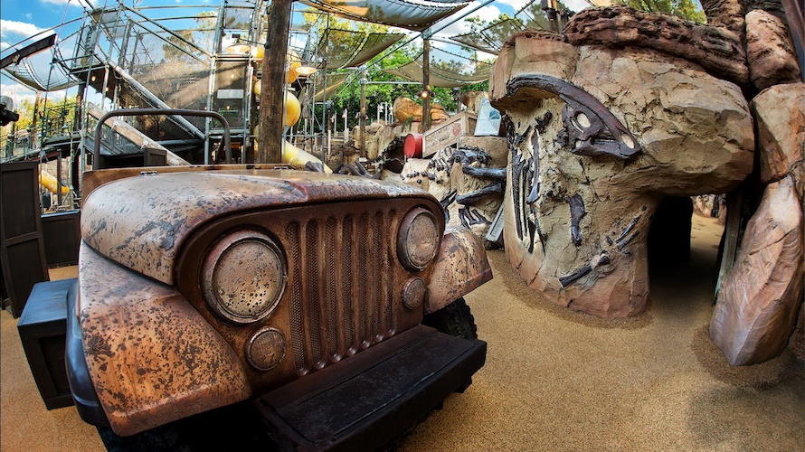 - The area allows guests to run around a playground designed to look like a dinosaur dig site (complete with sand pit where kids can literally dig and unearth a dinosaur fossil (permanently in place)), explore caves, cross rope bridges, and go down slides.