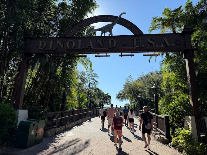 As you approach TriloBites and the former main entrance to DinoLand U.S.A. at Disney’s Animal Kingdom, you’ll notice that something is missing. The iconic dinosaur bones forming the Olden Gate Bridge have been removed, along with much of The Boneyard itself.