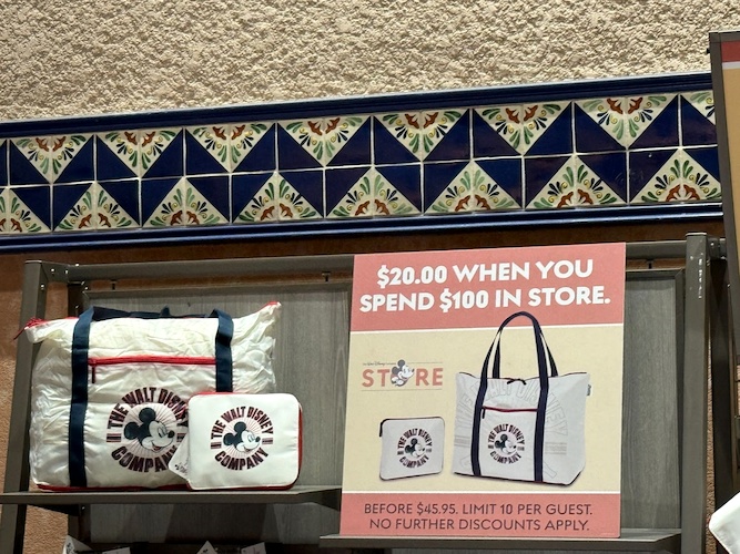- The Walt Disney Company tote bag and pouch set for $20 when you spend $100 in store. (Normally $45.95, Limit 10 per guest)