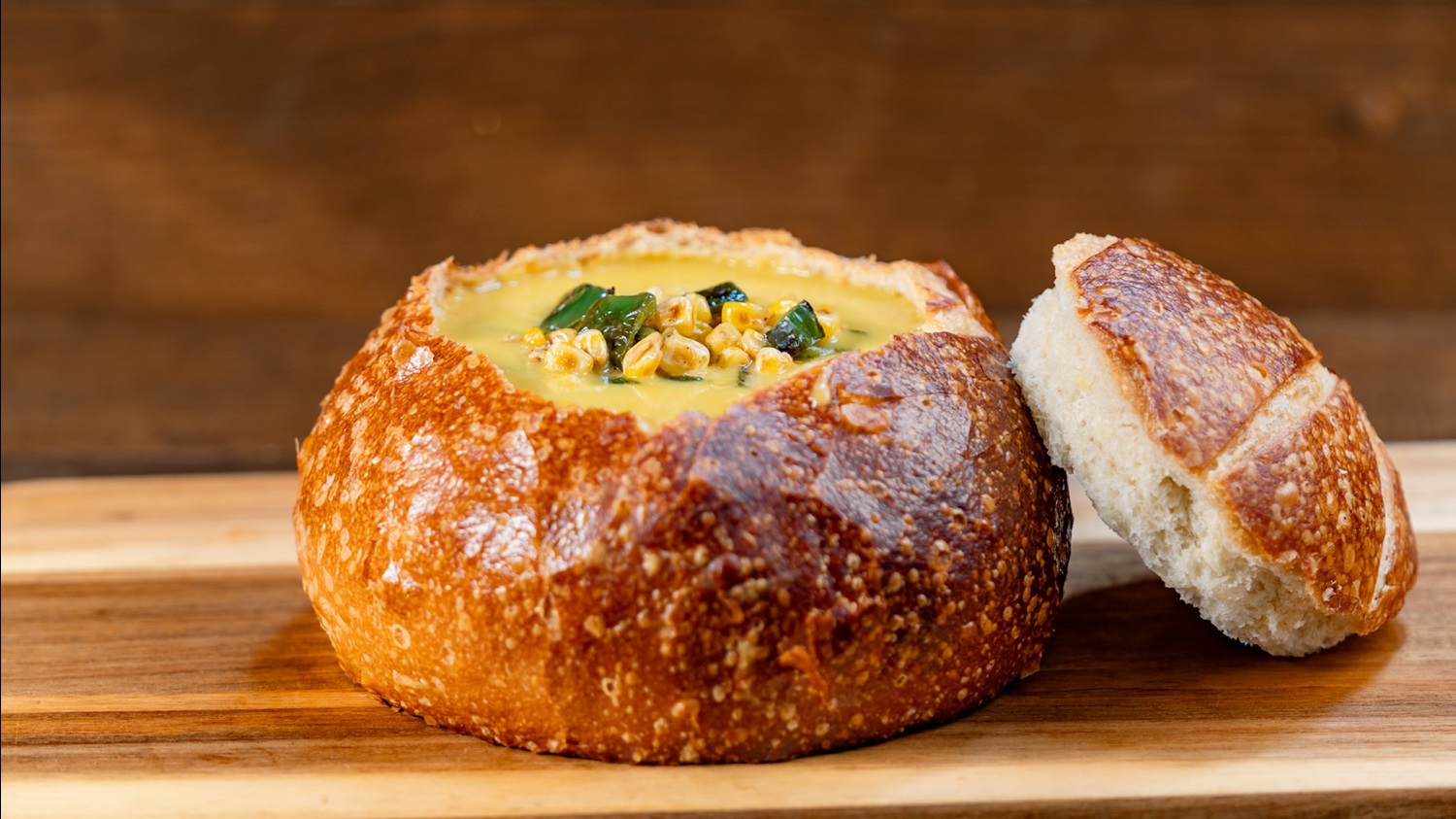 Roasted corn soup topped with pasilla and roasted corn served in a sourdough bread bowl (Plant-based).