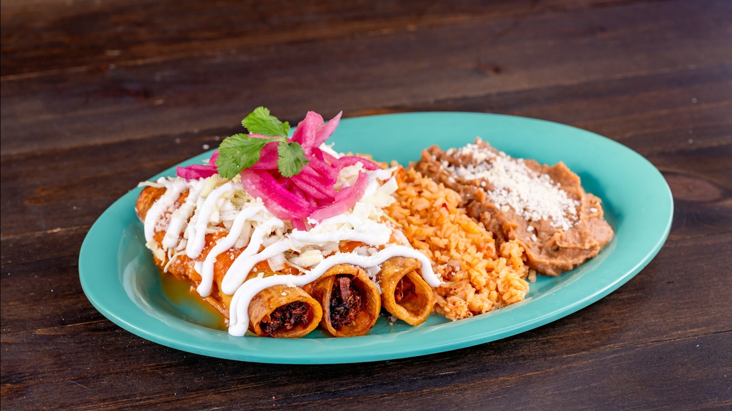 Topped with shredded lettuce, crema, queso fresco, salsa roja, and pickled onions served with Spanish rice and refried beans.