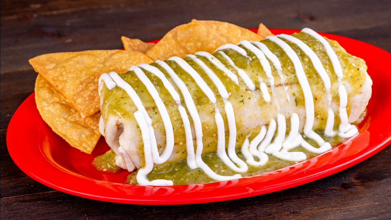 Peruvian-inspired lomo saltado stir-fry, shoestring french fries, and serrano-lime rice wrapped in a warm flour tortilla and served with serrano hot sauce.