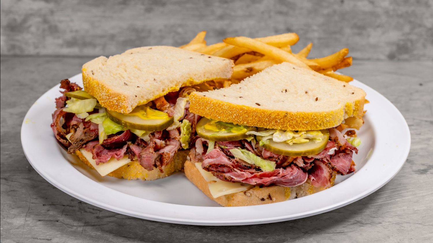 Sliced deli-style pastrami, Swiss cheese, pickle chips, shredded lettuce, and mustard on fresh-sliced rye bread.