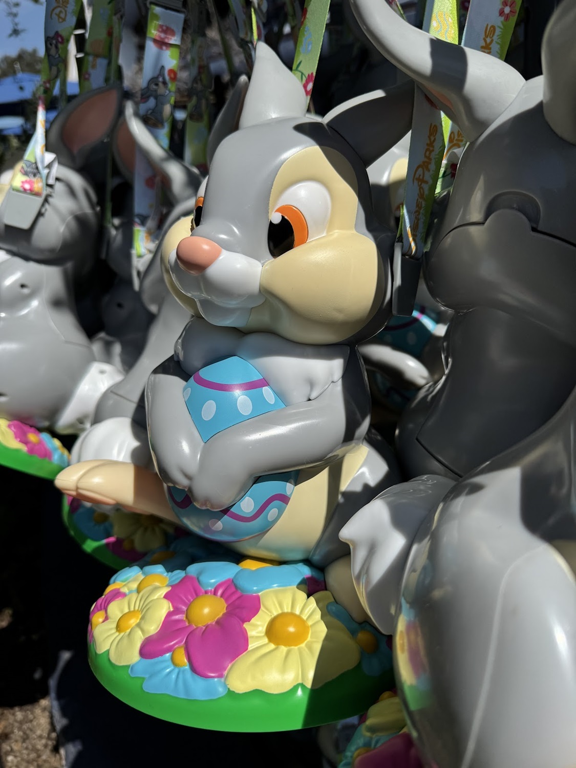 - Beautifully sculpted, the bucket features Bambi’s pal sitting atop a bed of flowers, holding an Easter egg in his paws.