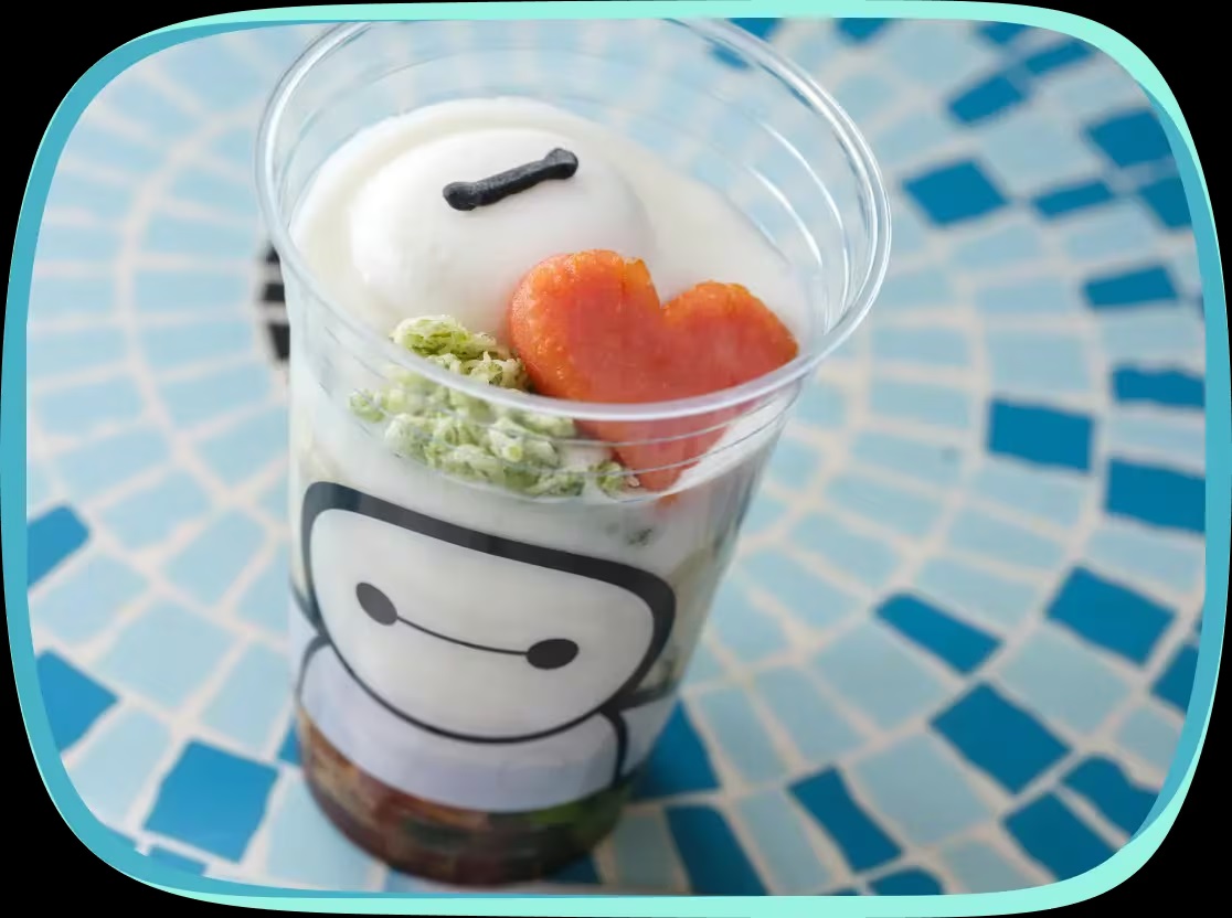 At Plaza Pavilion Restaurant in Tokyo Disneyland, cold udon served in cups featuring Baymax will be available. The dish includes plenty of toppings, such as a heart-shaped sweet potato mochi, soft-boiled egg shaped like Baymax and grilled beef. Conveniently served in a cup, it can be easily enjoyed on the go or while waiting for the parade and other experiences.