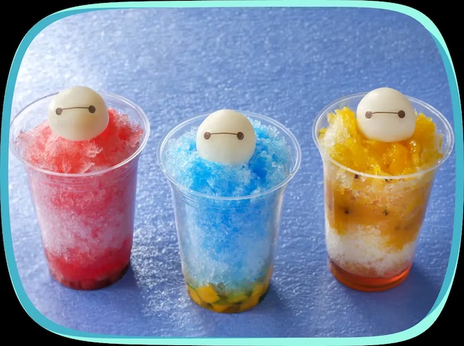 Additionally, classic shaved ice will also be available at both parks. At Tokyo Disneyland, multiple options will be on the menu, with each shaved ice featuring different fruits and topped with a cute Baymax mochi. At Tokyo DisneySea, refreshing and colorful menu items will be featured, such as a strawberry-loaded shaved ice and another with lassi flavors.