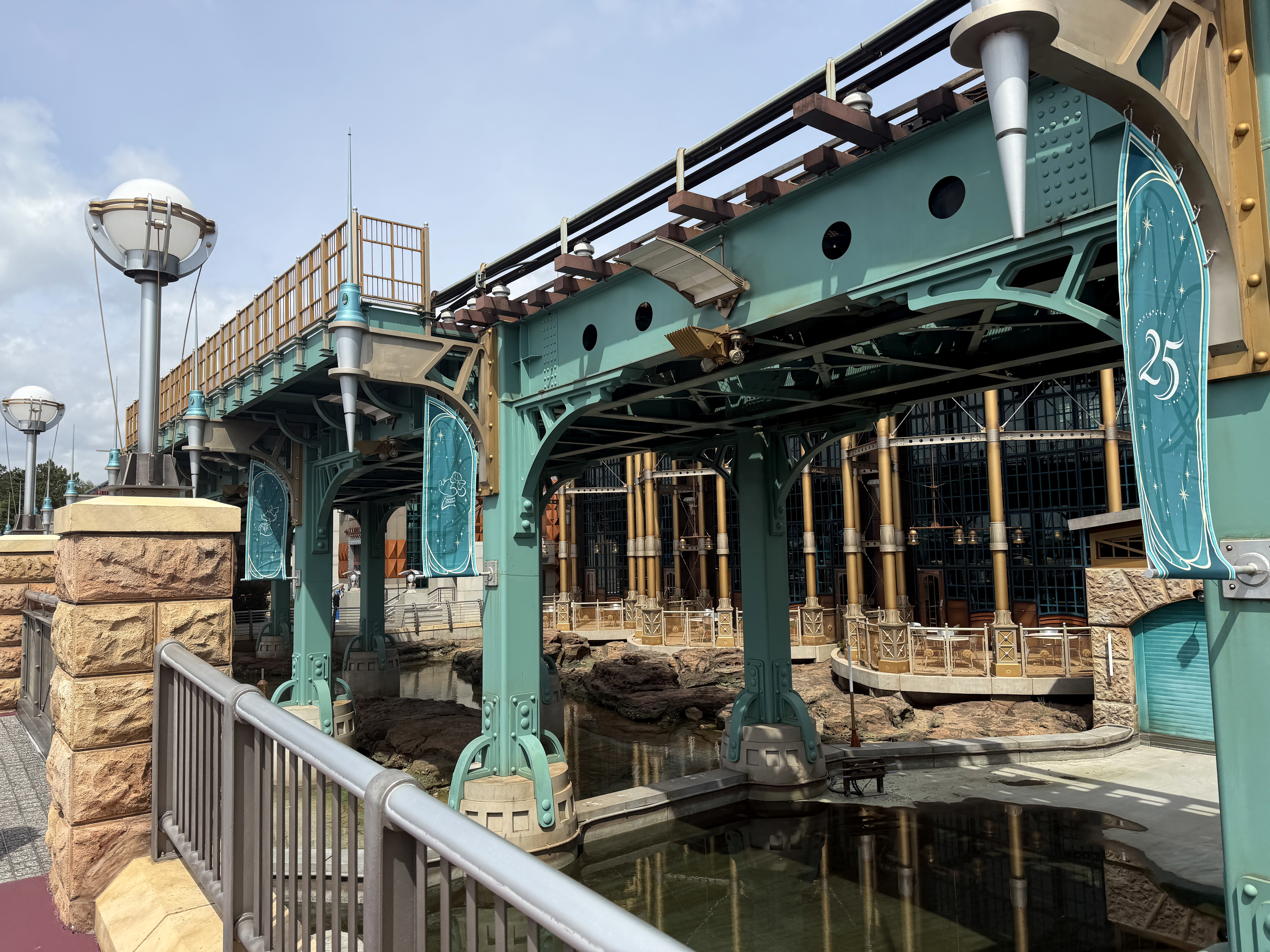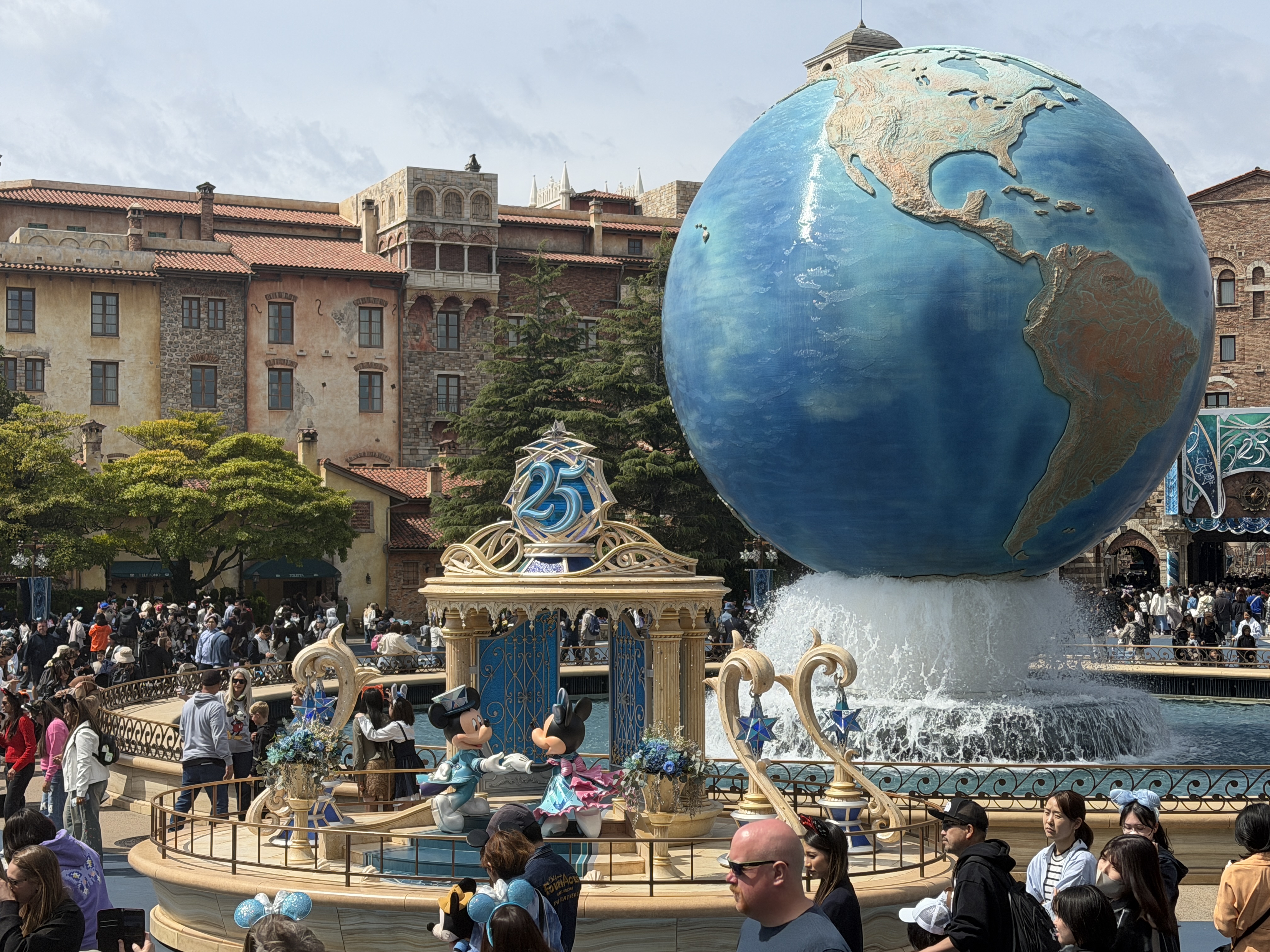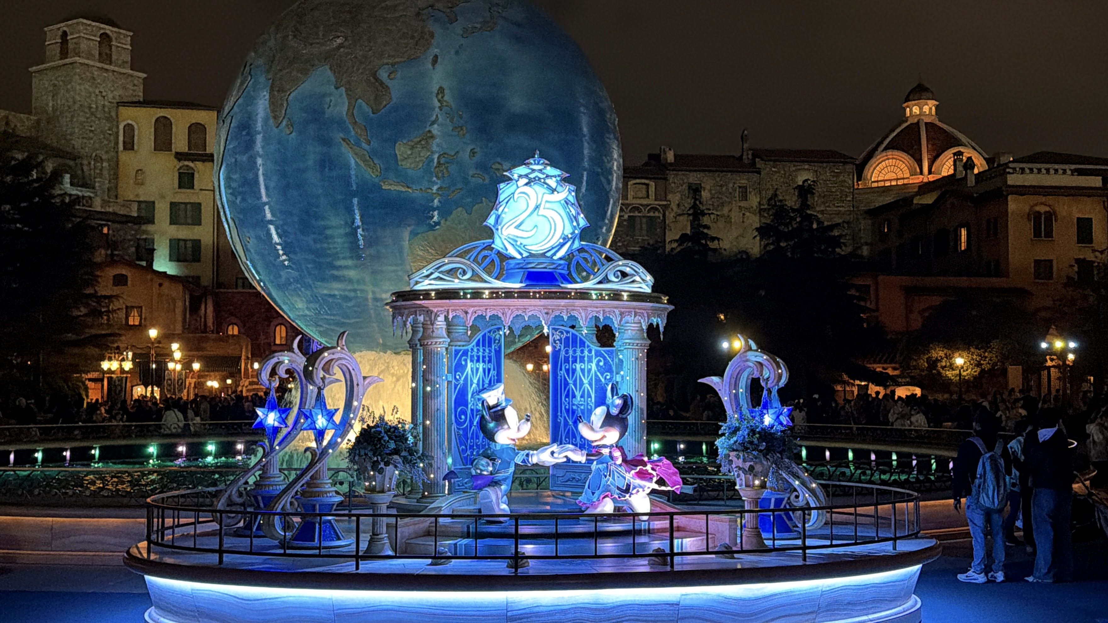 As part of the fun of the 25th anniversary celebration at Tokyo DisneySea - Sparkling Jubilee - the whole park features special decorations to mark the anniversary milestone. It all starts at the park entrance, where the AquaSphere has several embellishments to mark the occasion.