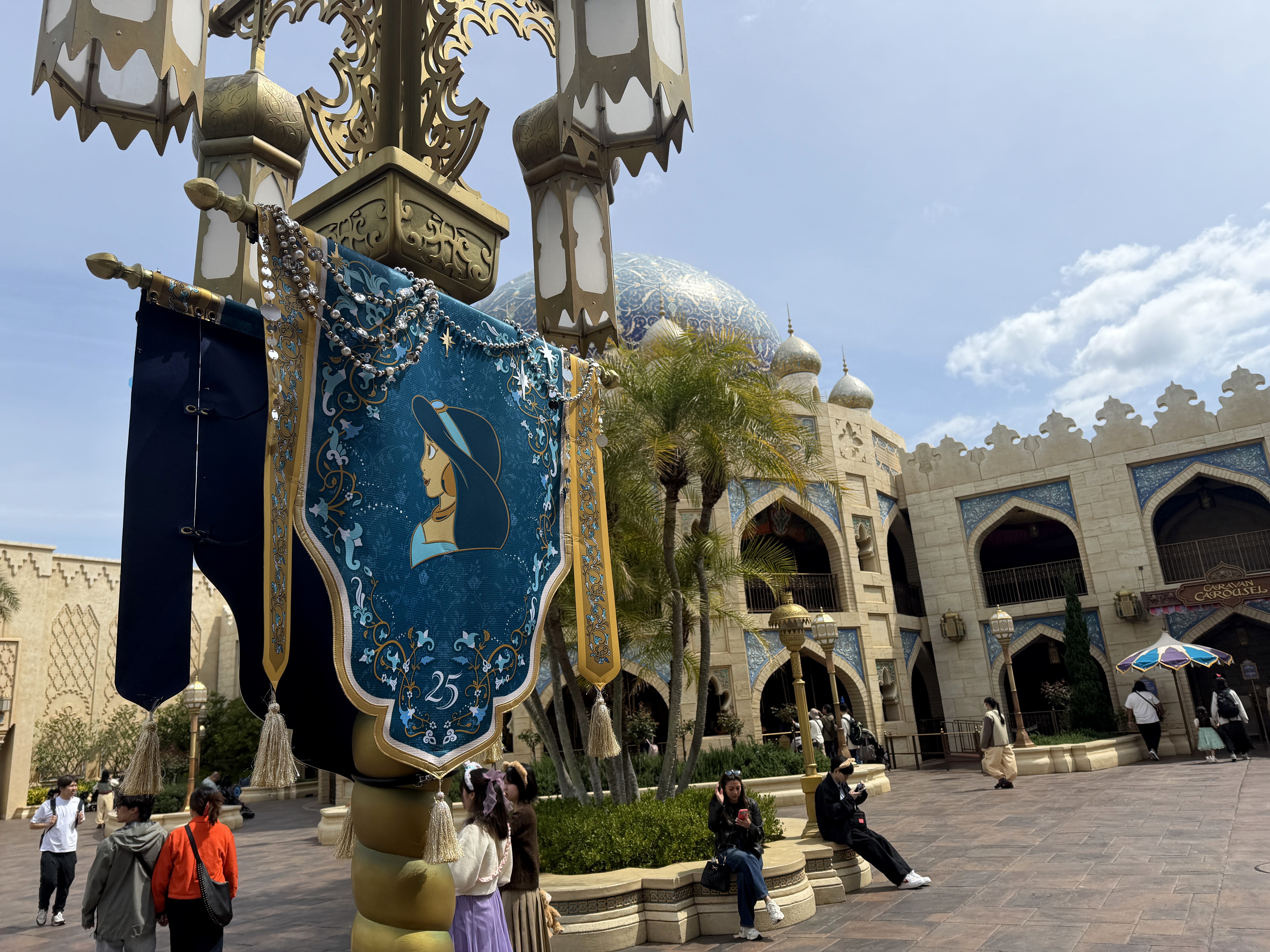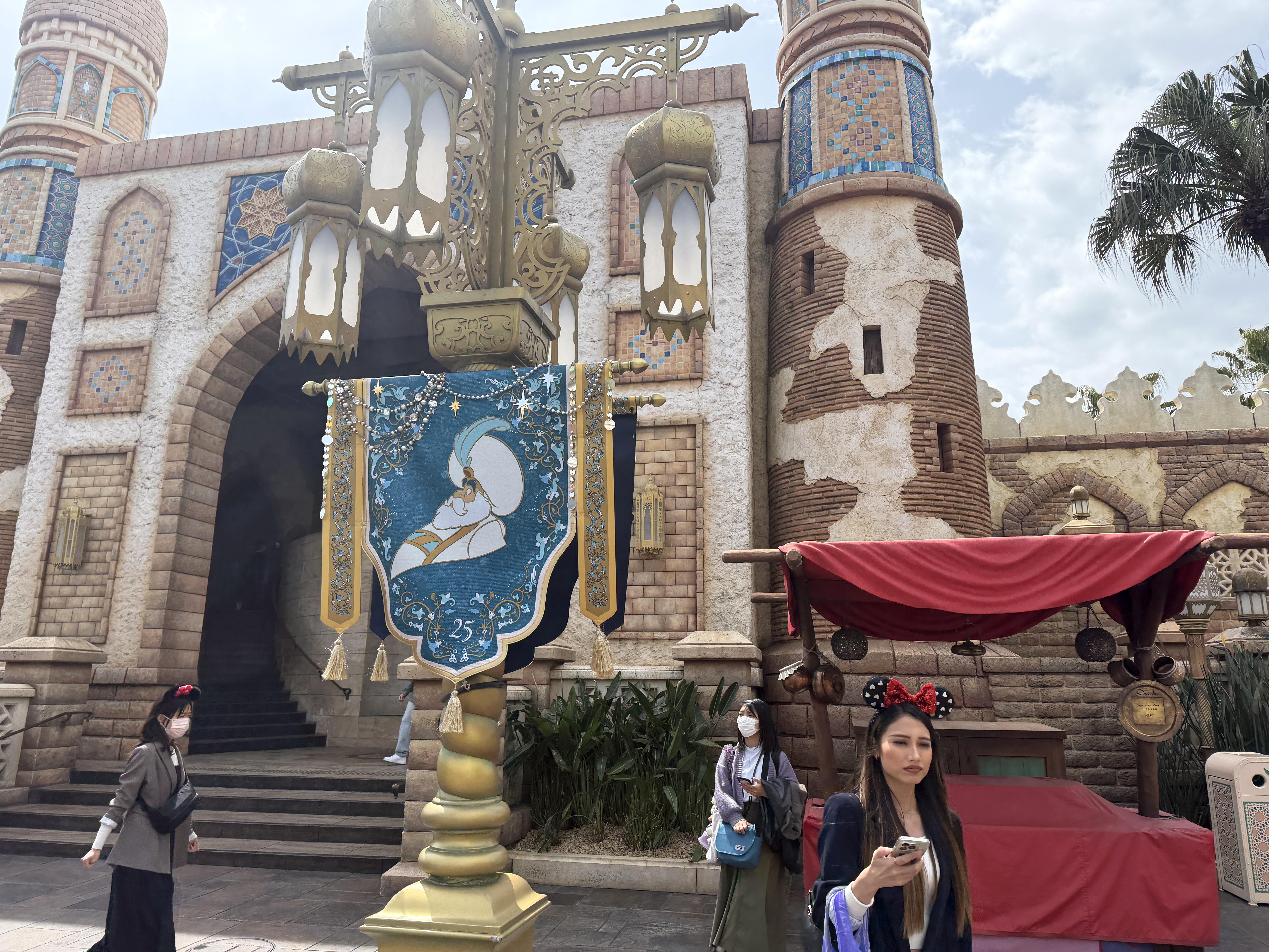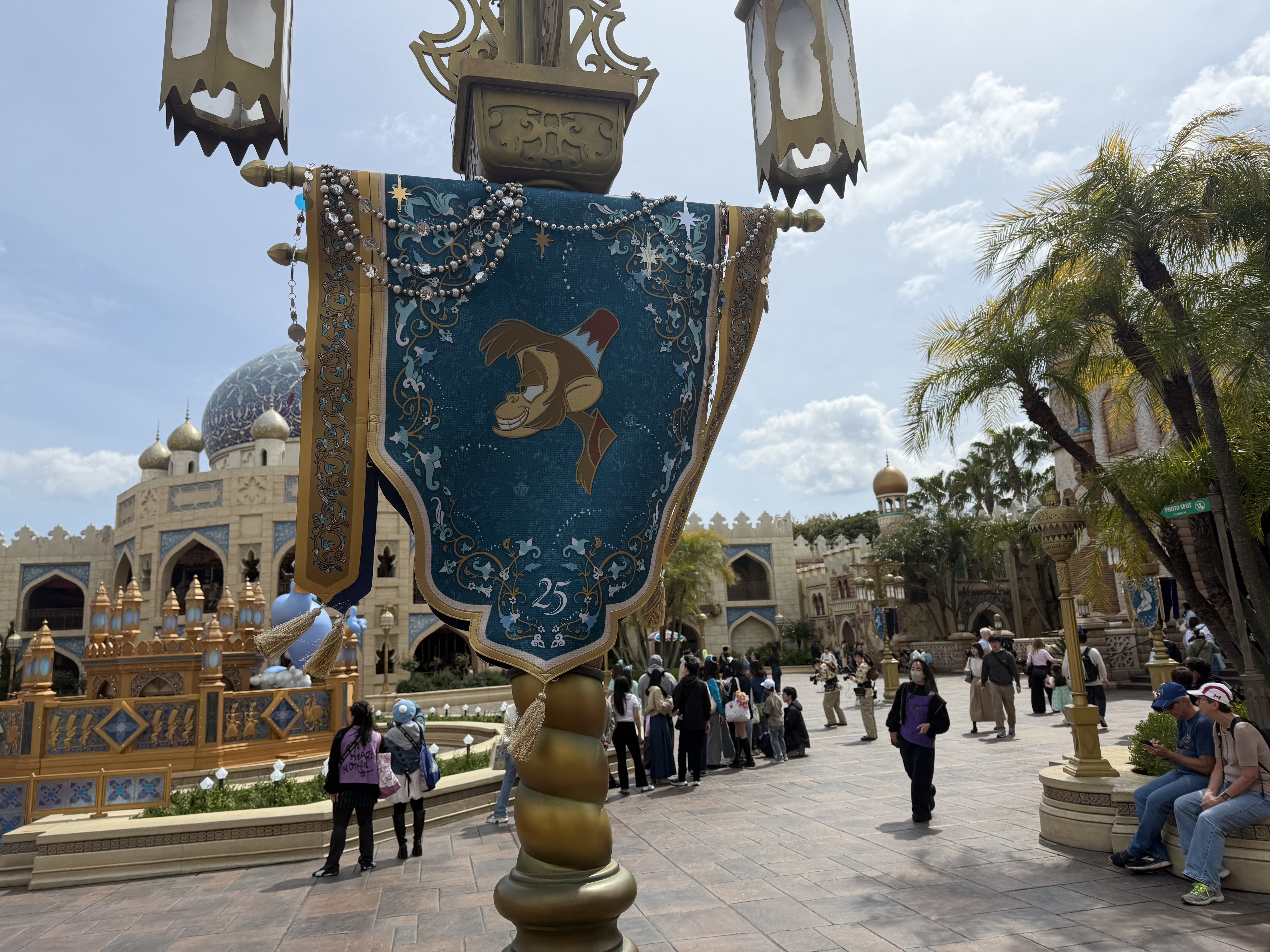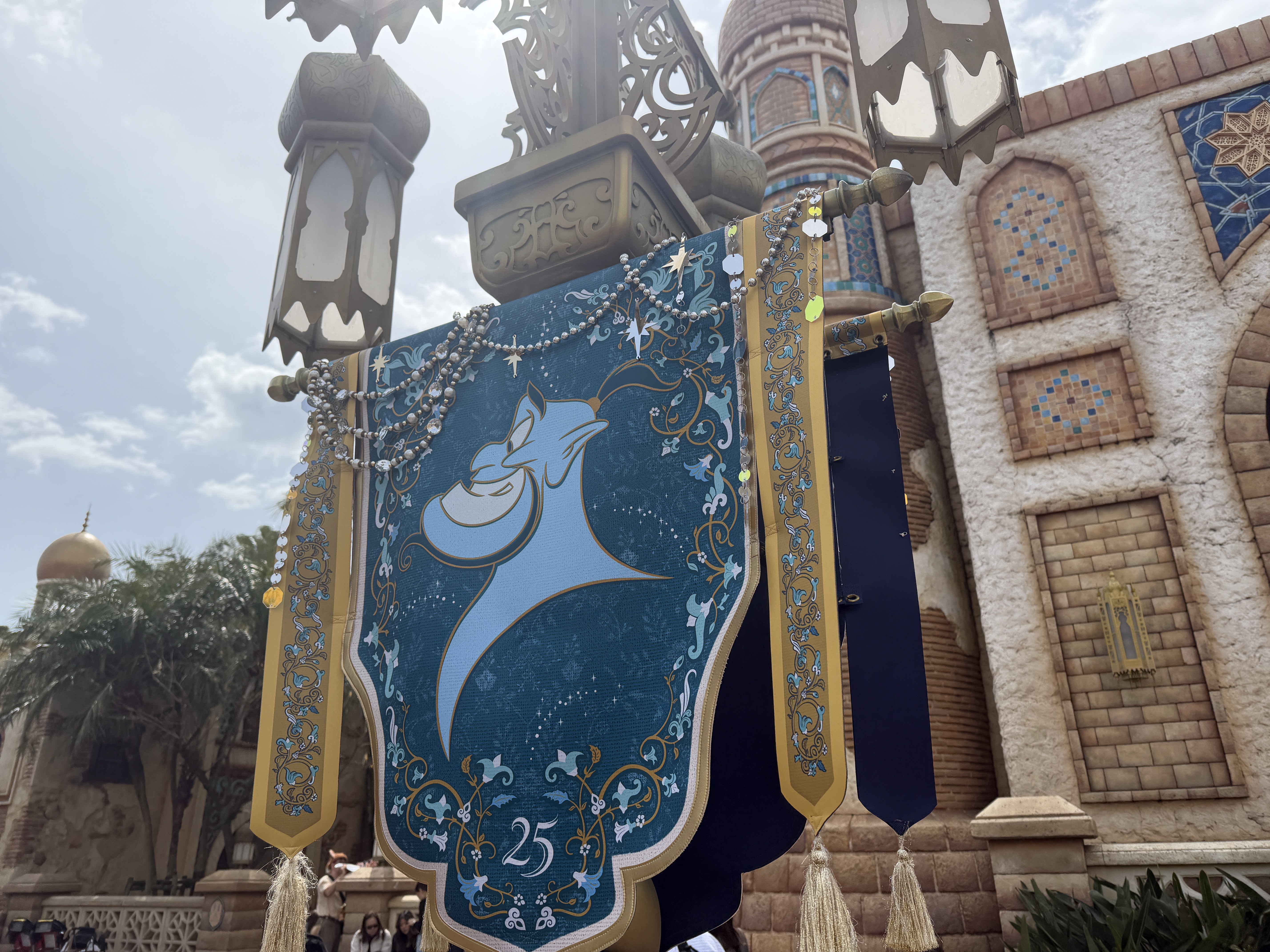 While the park's Arabian Coast isn't solely based on the film, Aladdin, Genie takes center stage on a special feature, surrounded banners featuring characters from the classic Walt Disney Animation Studios film.