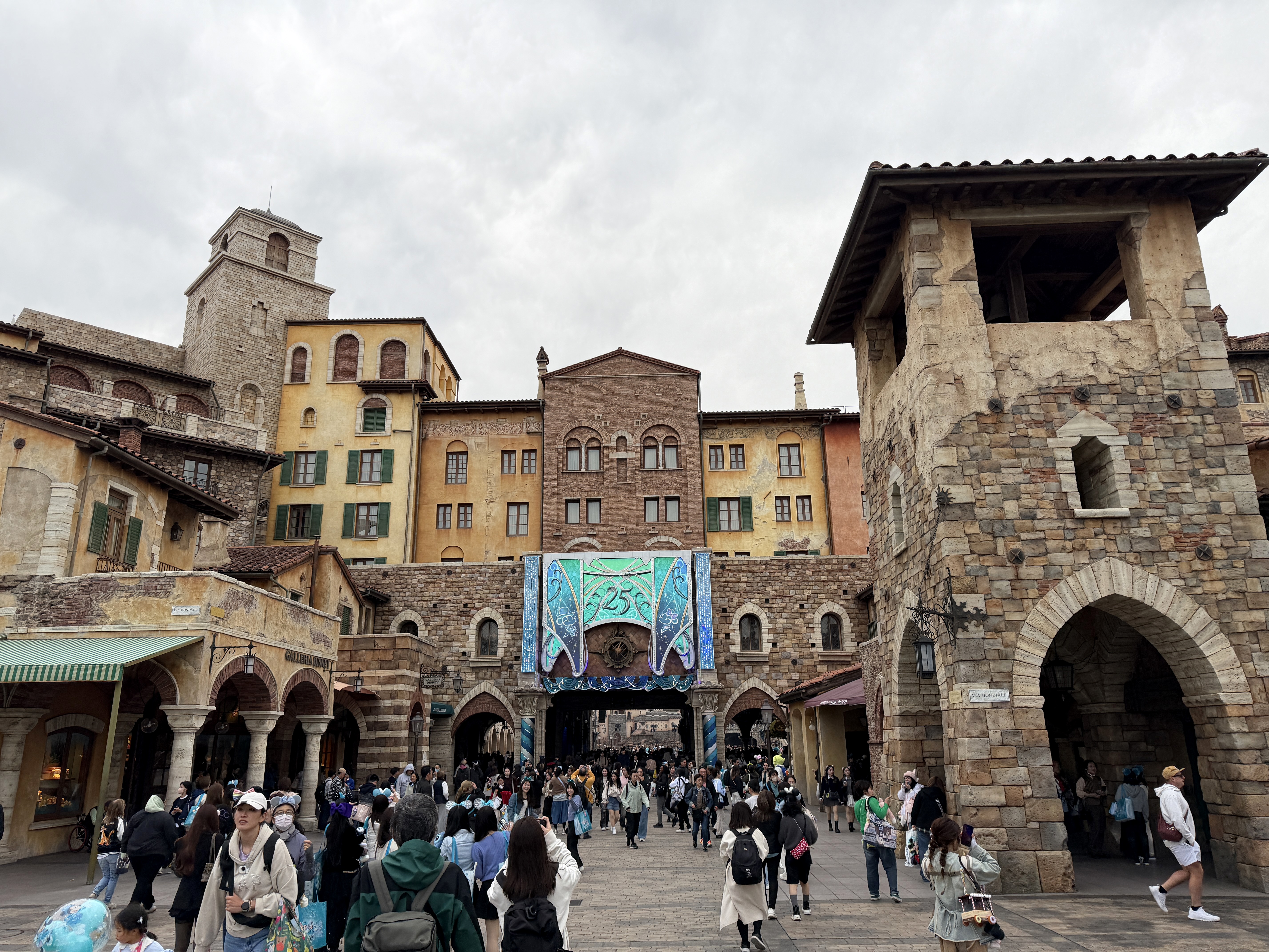 The Mediterranean Harbor not only serves as the entrance of the park, but also home to a lot of the decor - welcoming those to the park to celebrate the milestone. The archways of the Hotel MiraCosta (which has decor all their own) are adorned with features, and banners permeate the plazas.